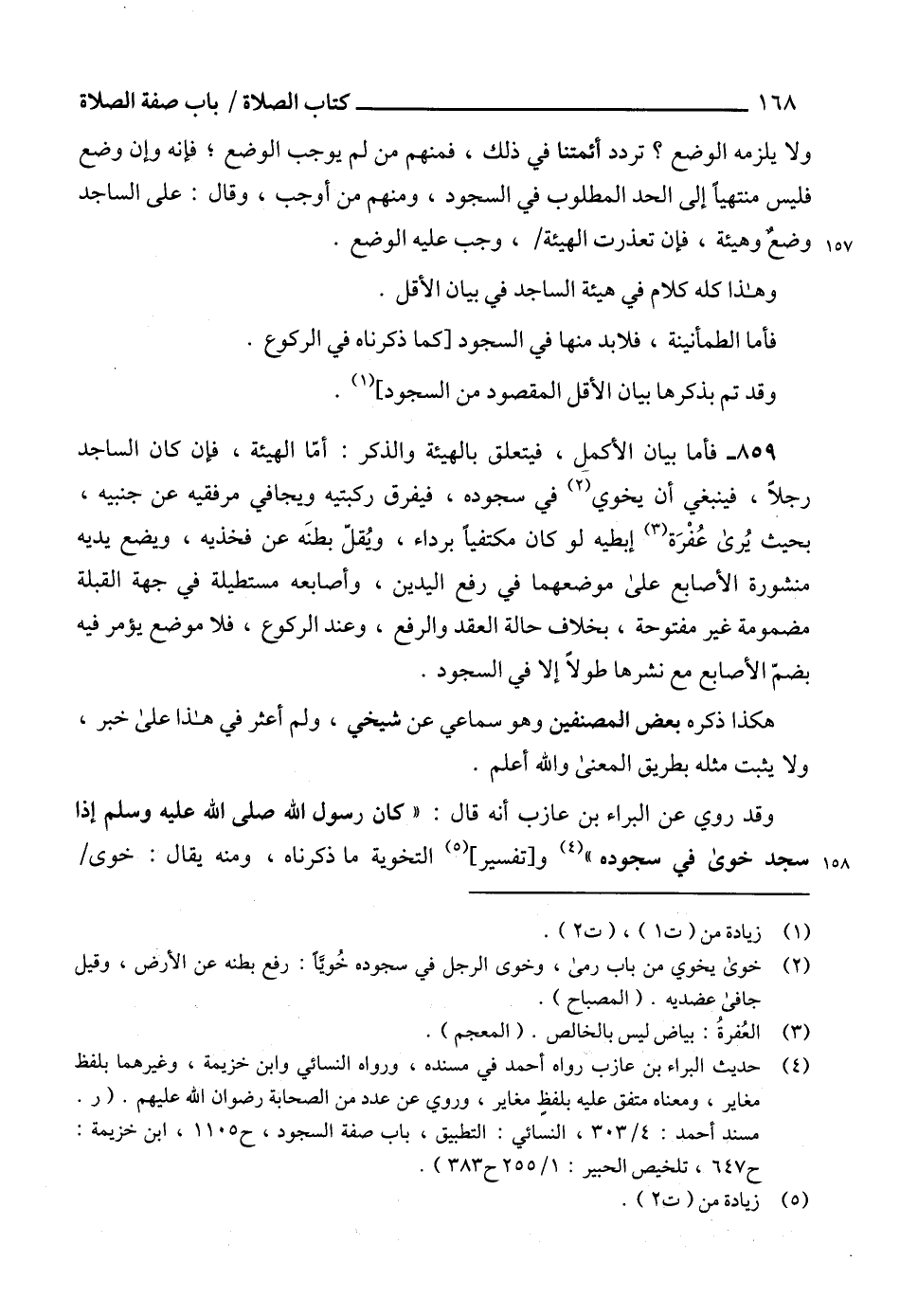 (¬4) حديث البراء بن عازب رواه أحمد في مسنده، ورواه النسائي وابن خزيمة، وغيرهما بلفظ مغاير، ومعناه متفق عليه بلفط مغاير، وروي عن عدد من الصحابة رضوان الله عليهم. (ر. مسند أحمد: 4/ 303، النسائي: التطبيق، باب صفة السجود، ح 1105، ابن خزيمة: ح 647، تلخيص الحبير: 1/ 255 ح 383).