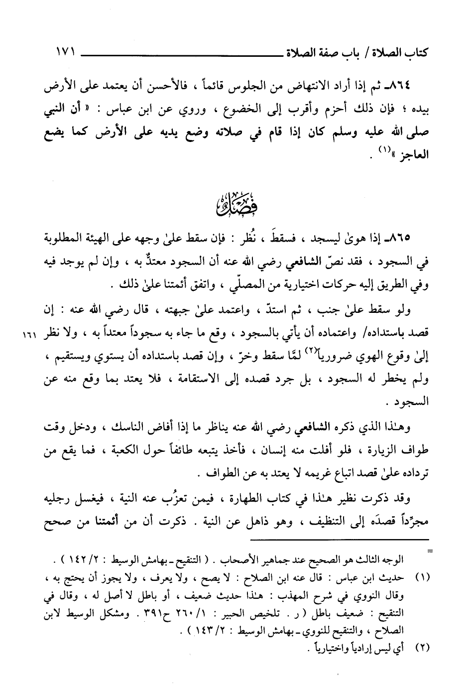 864 - ثم إذا أراد الانتهاض من الجلوس قائماً، فالأحسن أن يعتمد على الأرض بيده؛ فإن ذلك أحزم وأقرب إلى الخضوع، وروي عن ابن عباس: "أن النبي صلى الله عليه وسلم كان إذا قام في صلاته وضع يديه على الأرض كما يضع العاجز" (¬1).