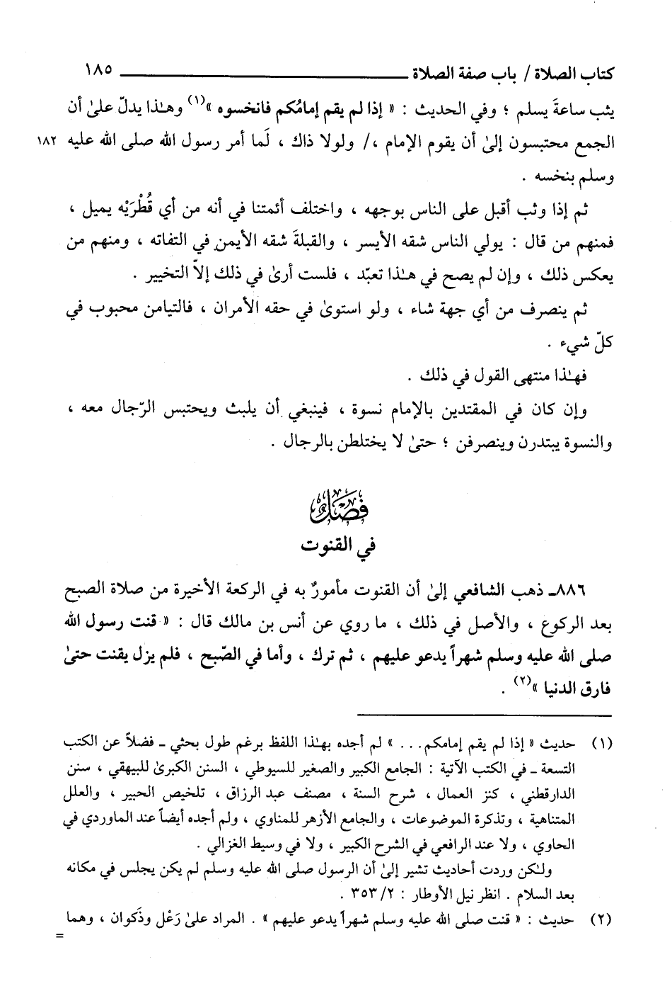 886 - ذهب الشافعي إلى أن القنوت مأمورٌ به في الركعة الأخيرة من صلاة الصبح بعد الركوع، والأصل في ذلك، ما روي عن أنس بن مالك قال: "قنت رسول الله صلى الله عليه وسلم شهراً يدعو عليهم، ثم ترك، وأما في الصّبح، فلم يزل يقنت حتى فارق الدنيا" (¬2).