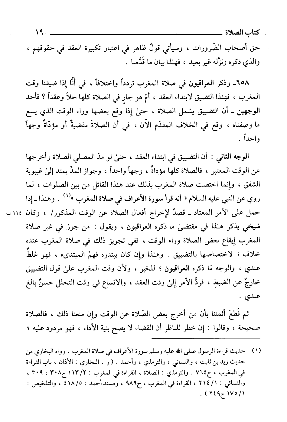 658 - وذكر العراقيون في صلاة المغرب تردداً واختلافاً، في أَنَّا إِذا ضيقنا وقت المغرب، فهذا التضيق لابتداء العقد، أمْ هو جارٍ في الصلاة كلها حلاً وعقداً؟ فأحد الوجهين - أن التضييق يشمل الصلاة، حتى إِذا وقع بعضها وراء الوقت الذي يسمع ما وصفناه، وقع في الخلاف المقدّم الآن، في أن الصلاةَ مقضيةٌ أو مؤدّاةٌ وجهاً واحداً.