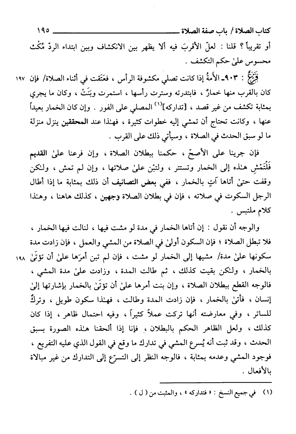 903 - الأَمةُ إذا كانت تصلي مكشوفة الرأس، فعَتَقت في أثناء الصلاة فإن كان بالقرب منها خمارٌ، فابتدرته وسترت رأسها، استمرت وبَنَتْ، وكان ما يجري بمثابة تكشف من غير قصد، [تداركه] (¬1) المصلي على الفور. وإن كان الخمار بعيداً عنها، وكانت تحتاج أن تمشي إليه خطوات كثيرة، فهذا عند المحققين ينزل منزلة ما لو سبق الحدث في الصلاة، وسيأتي ذلك على القرب.