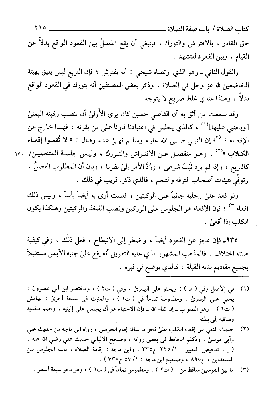 (¬1) في الأصل وفي (ط): ويحنو على اليسرى، وفي (ت 2)، ومختصر ابن أبي عصرون: يحني على اليسرى. ومطموسة تماماً في (ت 1)، والمثبت في نسخة أخرى: بهامش (ت 2). وهو الصواب -إن شاء الله- فإن الاحتباء هو أن يجلس على إليتيه، ويضم فخذيه وساقيه إلى بطنه.