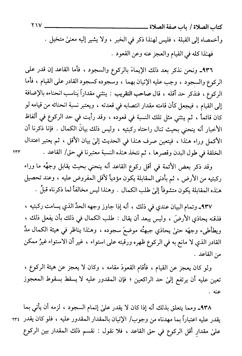 936 - ونحن نذكر بعد ذلك الإيماءَ بالركوع والسجود، فأما القاعد إن قدر على الركوع والسجود، وجب عليه الإتيان بهما، وسجوده كسجود القادر على القيام، فأما الركوع، فنذكر حد أقله، قال صاحب التقريب: ينثني مقداراً يناسب انحناءه بالإضافة إلى القيام، فيجعل كأن قامته مقدار انتصابه في قعدته، ويعتبر نسبة انحنائه من قيامه لو كان قائماً، ثم ينثني مثل تلك النسبة في قعوده، وقد رأيت في حد الركوع في ألفاظ الأخبار أنه ينحني بحيث تنال راحتاه ركبتيه، وليس ذلك بيانَ الكمال. فإنا ذكرنا أن الأكمل وراء هذا، فيتعين صرف هذا في الحديث إلى بيان الأقل، ثم يعتبر اعتدال الخلقة في طول البدن وقصرها، ثم نتخذ هذه النسبة معتبرنا في حق القاعد.