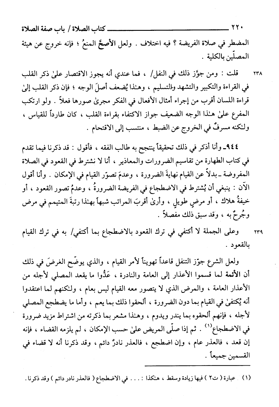 944 - وأنا أذكر في ذلك تحقيقاً ينتجح به طالب الفقه، فأقول: قد ذكرنا فيما تقدم في كتاب الطهارة من تقاسيم الضرورات والمعاذير، أنا لا نشترط في القعود في الصلاة المفروضة - بدلاً عن القيام نهايةَ الضرورة، وعدمَ تصوّر القيام في الإمكان. وأنا أقول الآن: ينبغي أن يُشترط في الاضطجاع في الفريضة الضرورةُ، وعدمُ تصور القعود، أو خيفةُ هلاك، أو مرضٍ طويلٍ، وأرى أقربَ المراتب شبهاً بهذا رتبةَ المتيمم في مرض وجُرحٌ به، وقد سبق ذلك مفصلاً.