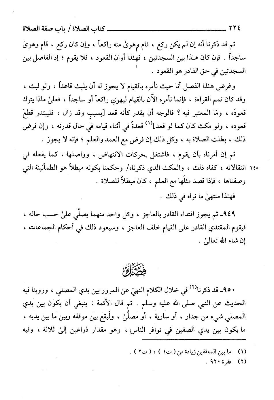 949 - ثم يجوز اقتداء القادر بالعاجز، وكل واحد منهما يصلّي على حسب حاله، فيقوم المقتدي القادر على القيام خلف العاجز، وسيعود ذلك في أحكام الجماعات، إن شاء الله تعالى.
