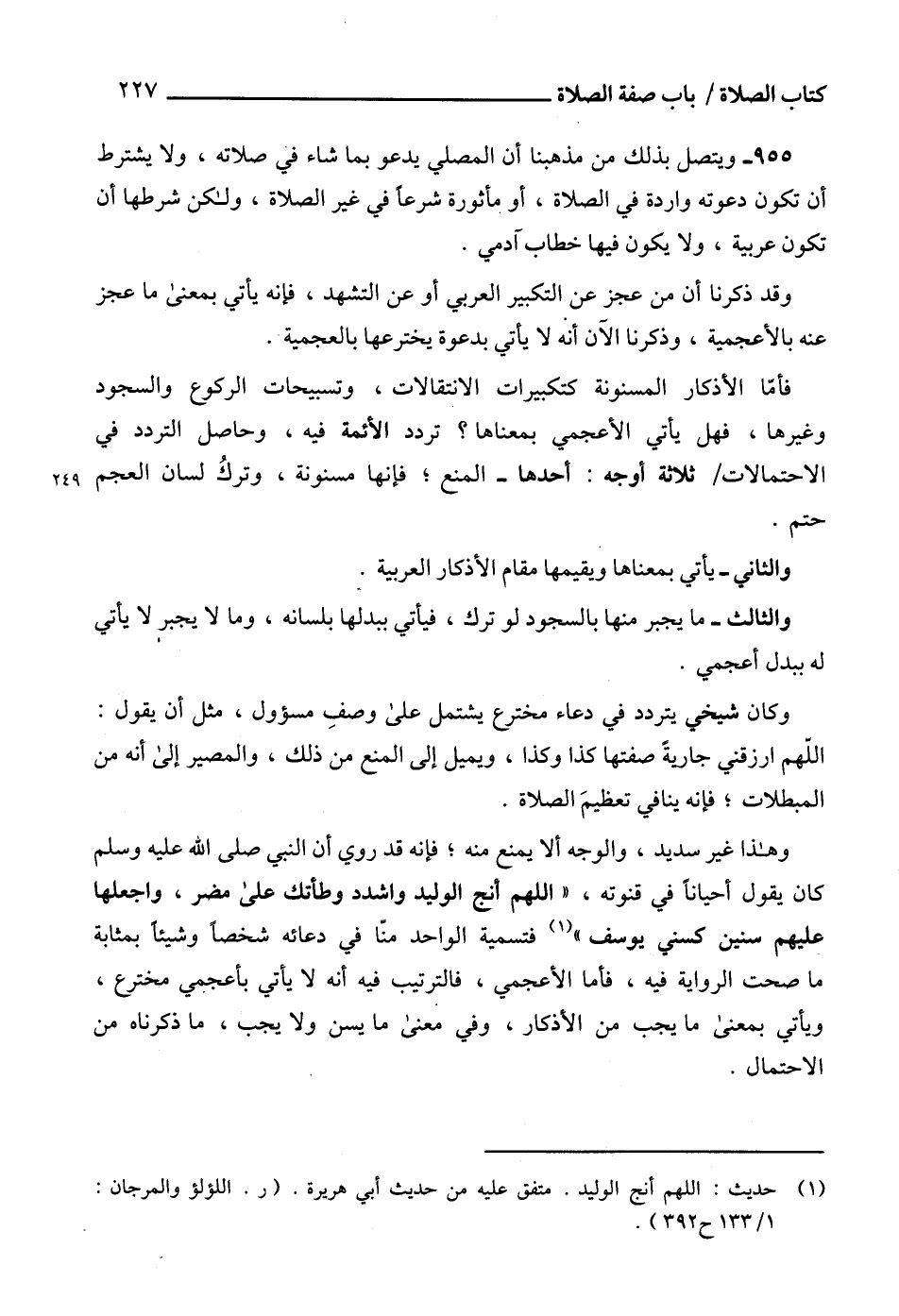 955 - ويتصل بذلك من مذهبنا أن المصلي يدعو بما شاء في صلاته، ولا يشترط أن تكون دعوته واردة في الصلاة، أو مأثورة شرعاً في غير الصلاة، ولكن شرطها أن تكون عربية، ولا يكون فيها خطاب آدمي.