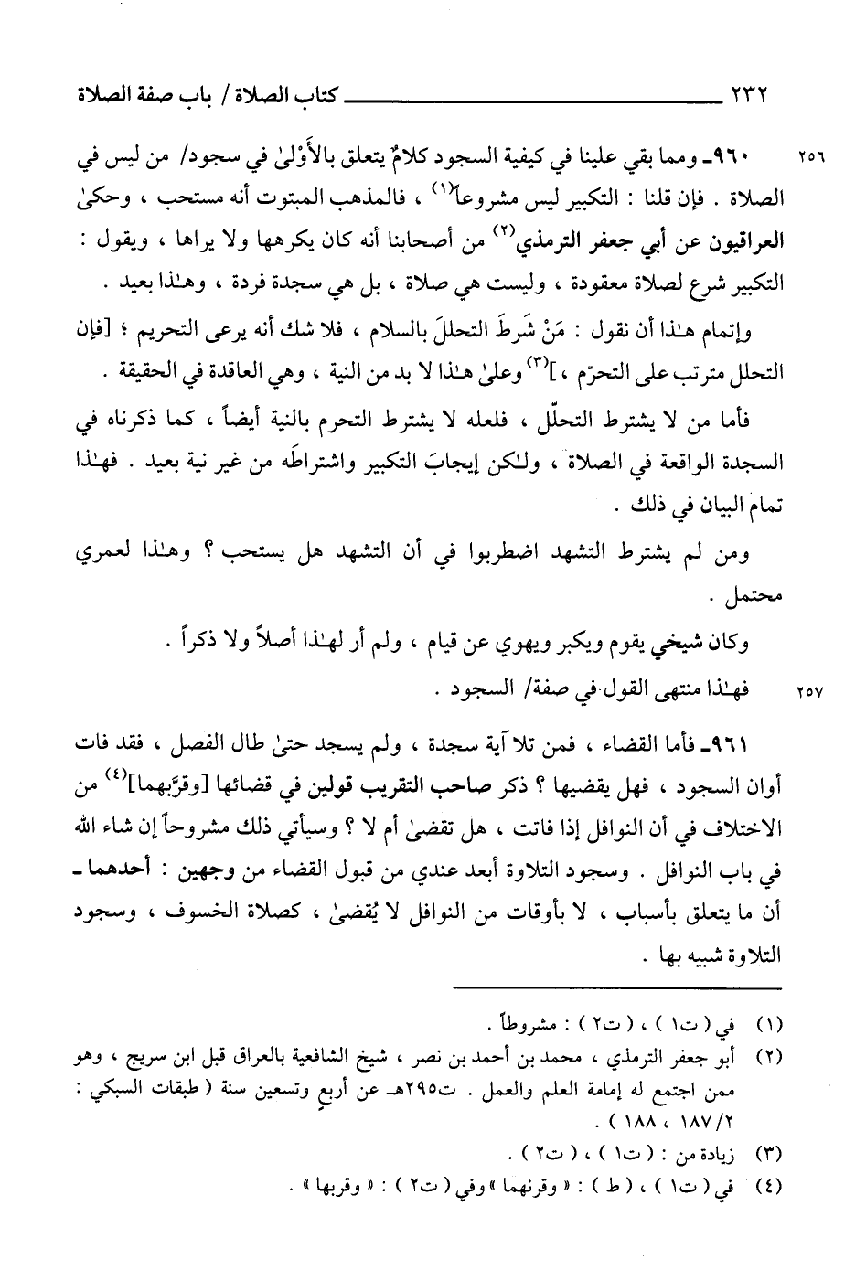 960 - ومما بقي علينا في كيفية السجود كلام يتعلق بالأَوْلى في سجود من ليس في الصلاة. فإن قلنا: التكبير ليس مشروعاً (¬1)، فالمذهب المبتوت أنه مستحب، وحكى العراقيون عن أبي جعفر الترمذي (¬2) من أصحابنا أنه كان يكرهها ولا يراها، ويقول: التكبير شرع لصلاة معقودة، وليست هي صلاة، بل هي سجدة فردة، وهذا بعيد.