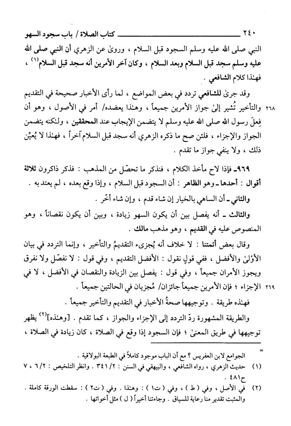 وقد جرى للشافعي تردد في بعض المواضع، لما رأى الأخبار صحيحة في التقديم والتأخير تُشير إلى جواز الأمرين جميعاًً، وهذا يعضده أمر في الأصول، وهو أن فِعلَ رسول الله صلى الله عليه وسلم لا يتضمن الإيجاب عند المحققين، ولكنه يتضمن الجواز والإجزاء، فلئن صح ما ذكره الزهري أنه سجد قبل السلام آخراً، فهذا لا يُعيِّن ذلك، ولا ينفي جواز ما تقدم.