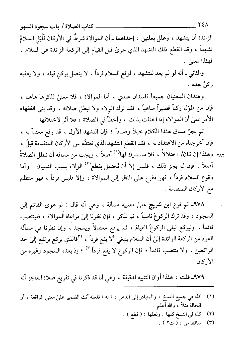 ثم يجرّ مساق هذا الكلام خبلاً وفساداً؛ فإن التشهد الأول، قد وقع معتداً به، فإن أخرجناه من الاعتداد به، فقد انقطع التشهد الذي نعتدُّه عن الأركان المتقدمة قبلُ، وهذا إن كان اختلالاً، فلا مستدرك لها (¬1) أصلاً، ويجب من مساقه أن تبطل الصلاةُ أصلاً، فإن لم يجز ذلك، فليس إلاّ أن يُحتمل بقطع (¬2) الوِلاء بسبب النسيان. وأما وقوع السلام فرداً، فهو مفرع على النظر إلى الموالاة، وإلا فليس فرداً، فهو منتظم مع الأركان المتقدمة.