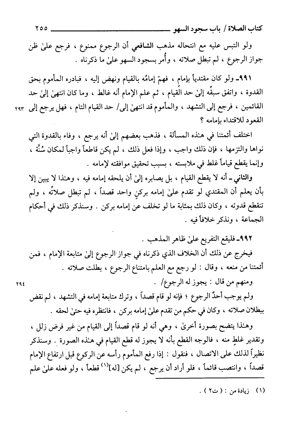 991 - ولو كان مقتدياً بإمامٍ، فهمّ إمامُه بالقيام ونهض إليه، فبادره المأموم بحق القدوة، واتفق سبقُه إلى حد القيام، ثم علم الإمام أنه غالط، وما كان انتهى إلى حد القائمين، فرجع إلى التشهد، والمأموم قد انتهى إلى حد القيام التام، فهل يرجع إلى القعود للاقتداء بإمامه؟