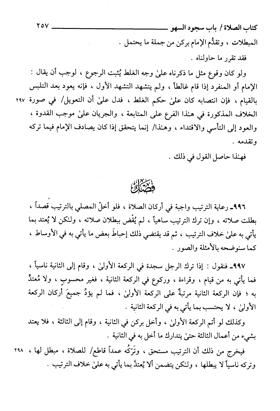 996 - رعاية الترتيب واجبة في أركان الصلاة، فلو أخلّ المصلي بالترتيب قصداً، بطلت صلاته، وإن ترك الترتيب ساهياً، لم يُقْض ببطلان صلاته، ولكن لا يُعتد بما يأتي به على خلاف الترتيب، ثم قد يقتضي ذلك إحباطَ بعض ما يأتي به في الأوساط، كما سنوضحه بالأمثلة والصور.