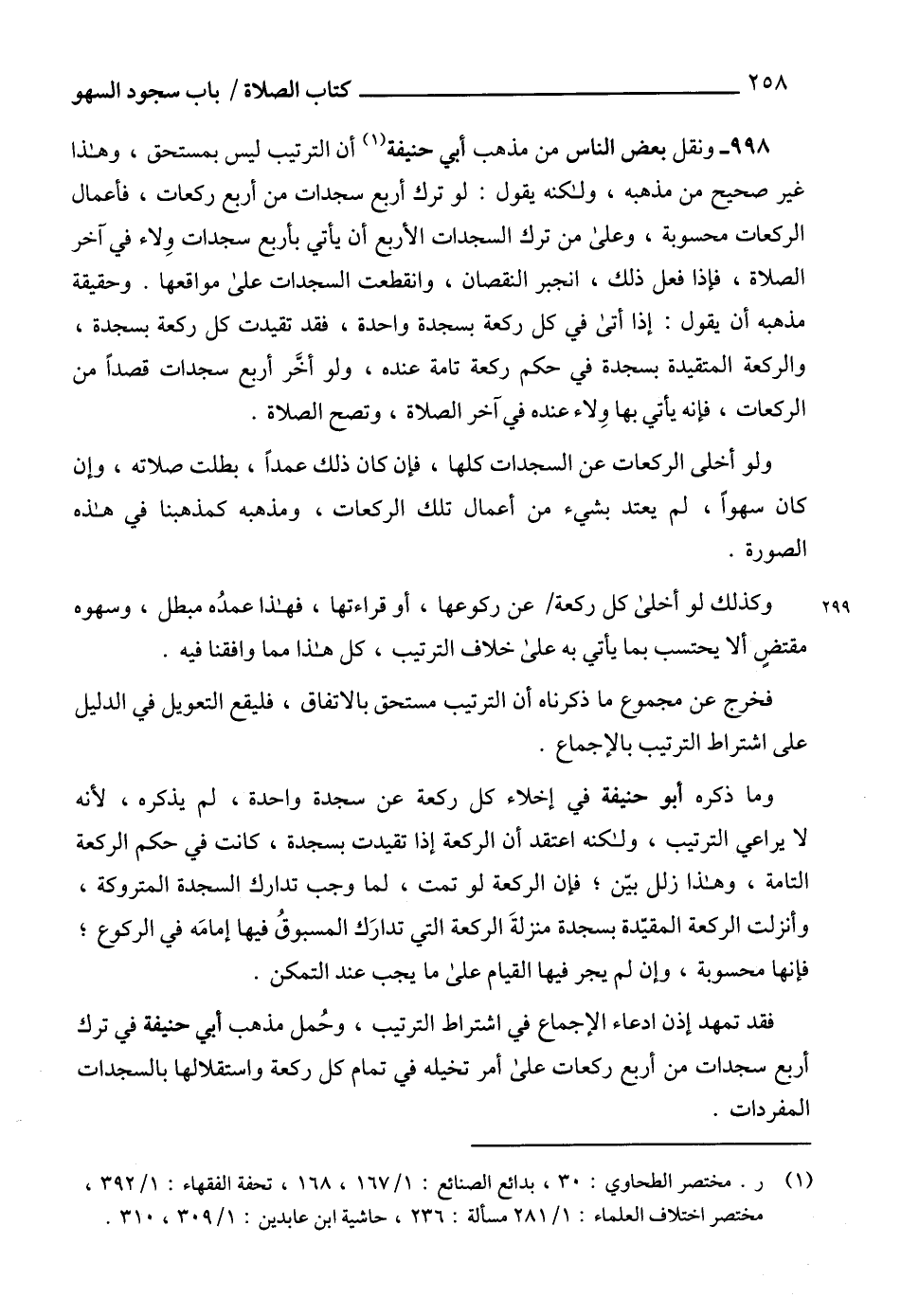 فقد تمهد إذن ادعاء الإجماع في اشتراط الترتيب، وحُمل مذهب أبي حنيفة في ترك أربع سجدات من أربع ركعات على أمر تخيله في تمام كل ركعة واستقلالها بالسجدات المفردات.