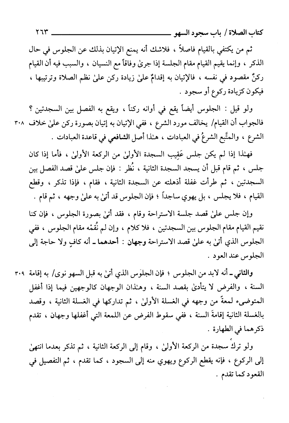 والثاني - أنه لابد من الجلوس؛ فإن الجلوَس الذي أتى به قبل السهو نوى به إقامة السنة، والفرض لا يتأدى بقصد السنة، وهذان الوجهان كالوجهين فيما إذا أغفل المتوضىء لمعةً من وجهه في الغسلة الأولى، ثم تداركها في الغسلة الثانية، وقصد بالغسلة الثانية إقامةَ السنة، ففي سقوط الفرض عن اللمعة التي أغفلها وجهان، تقدم ذكرهما في الطهارة.