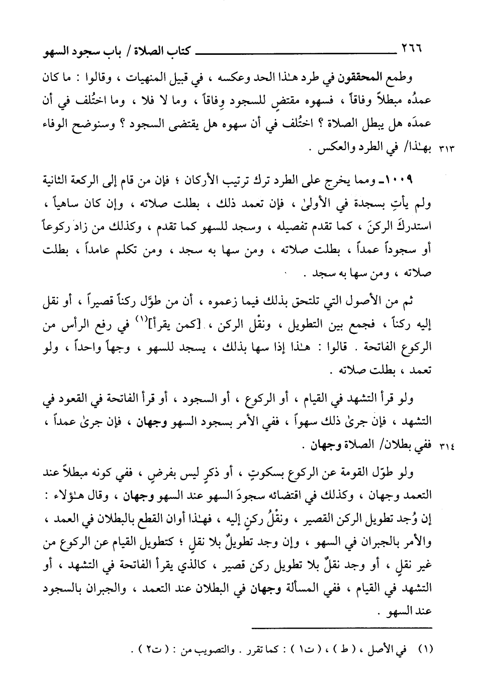 1009 - ومما يخرج على الطرد ترك ترتيب الأركان؛ فإن من قام إلى الركعة الثانية ولم يأتِ بسجدة في الأولى، فإن تعمد ذلك، بطلت صلاته، وإن كان ساهياً، استدركَ الركنَ، كما تقدم تفصيله، وسجد للسهو كما تقدم، وكذلك من زاد ركوعاً أو سجوداً عمداً، بطلت صلاته، ومن سها به سجد، ومن تكلم عامداً، بطلت صلاته، ومن سها به سجد.