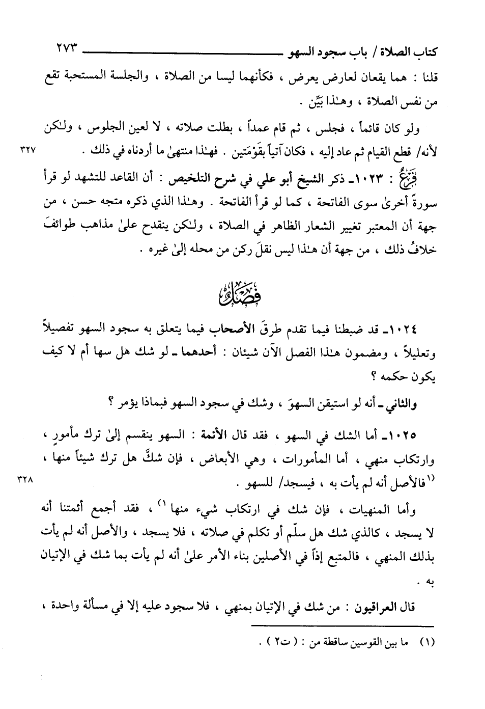 1024 - قد ضبطنا فيما تقدم طرقَ الأصحاب فيما يتعلق به سجود السهو تفصيلاً وتعليلاً، ومضمون هذا الفصل الآن شيئان: أحدهما - لو شك هل سها أم لا كيف يكون حكمه؟