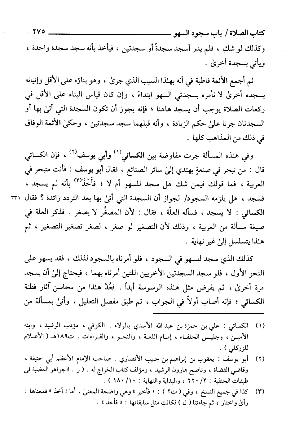 كذلك الذي سجد للسهو في السجود، فلو أمرناه بالسجود لذلك، فقد يسهو على النحو الأول، فلو سجد السجدتين الأخريين اللتين أمرناه بهما، فيحتاج إلى أن يسجد مرة أخرى، ثم يفرض مثل هذه الوسوسة أبداً. فعُدَّ هذا من محاسن آثار فطنة الكسائي؛ فإنه أصاب أولاً في الجواب، ثم طبق مفصل التعليل، وأتى بمسألة من