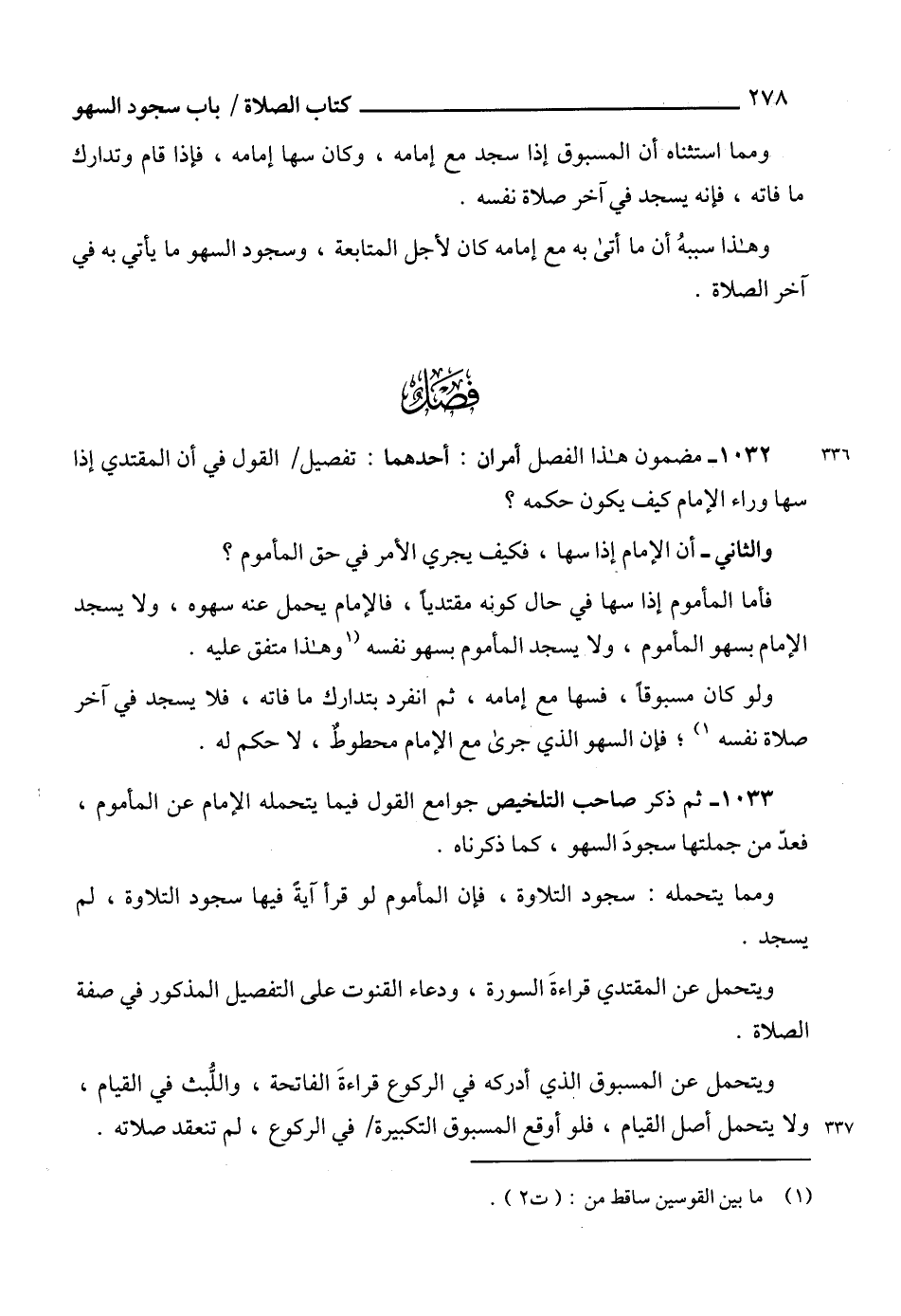 1032 - مضمون هذا الفصل أمران: أحدهما: تفصيل القول في أن المقتدي إذا سها وراء الإمام كيف يكون حكمه؟