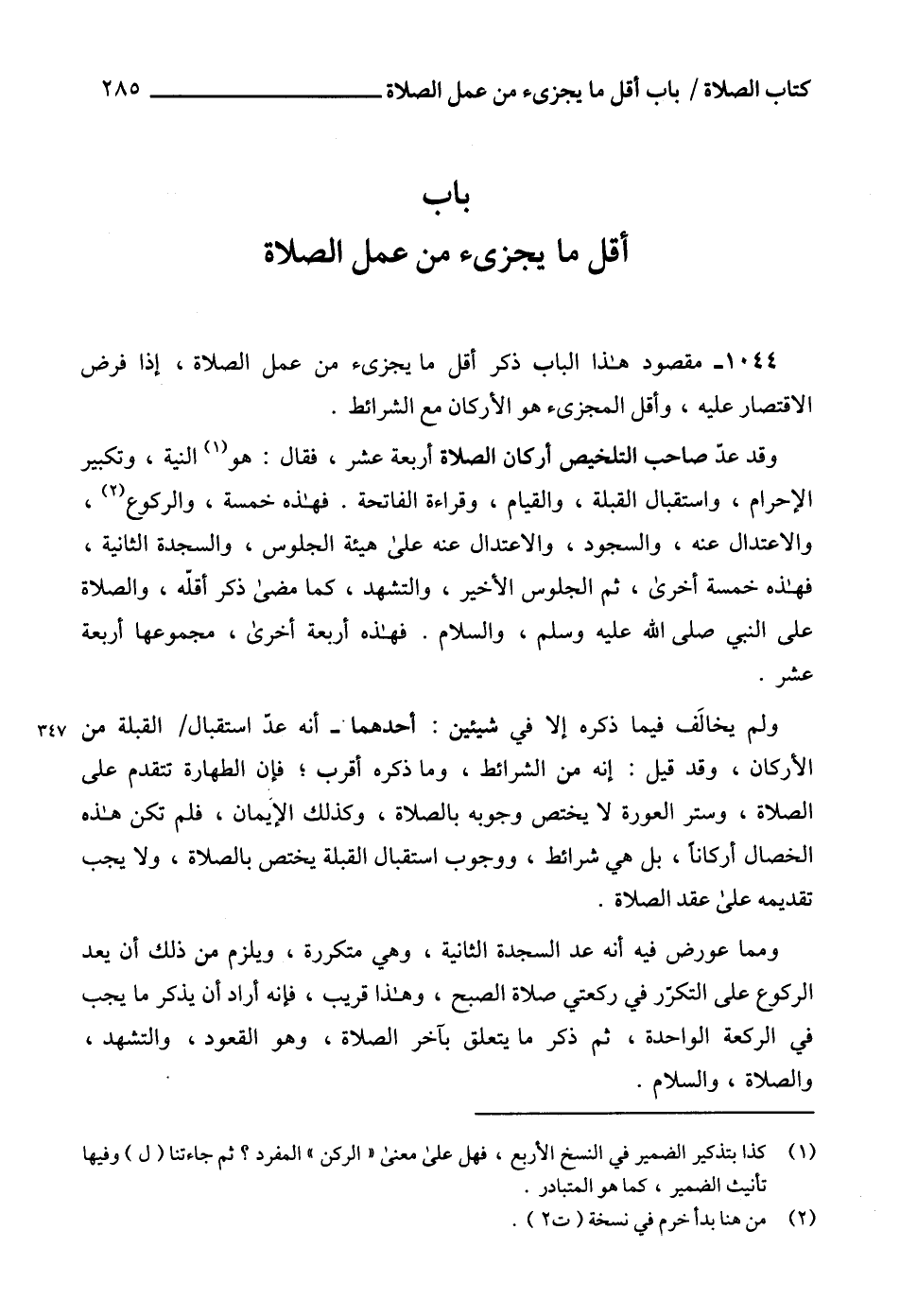1044 - مقصود هذا الباب ذكر أقل ما يجزىء من عمل الصلاة، إذا فرض الاقتصار عليه، وأقل المجزىء هو الأركان مع الشرائط.