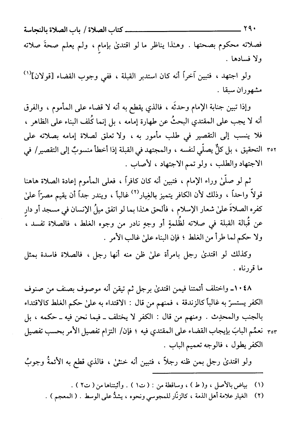 1048 - واختلف أئمتنا فيمن اقتدى برجل ثم تيقن أنه موصوف بصنف من صنوف الكفر يستسرّ به غالباً كالزندقة، فمنهم من قال: الاقتداء به على حكم الغلط كالاقتداء بالجنب والمحدِث. ومنهم من قال: الكفر لا يختلف -فيما نحن فيه- حكمه، بل نعمِّم البابَ بإيجاب القضاء على المقتدي فيه؛ فإن التزام تفصيل الأمر بحسب تفصيل الكفر يطول، فالوجه تعميم الباب.