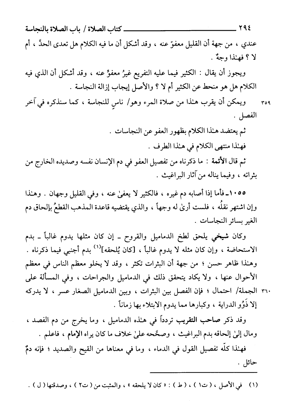 1055 - فأما إذا أصابه دم غيره، فالكثير لا يعفى عنه، وفي القليل وجهان. وهذا وإن اشتهر نقلُه، فلست أرى له وجهاً، والذي يقتضيه قاعدة المذهب القطعُ بإلحاق دم الغير بسائر النجاسات.