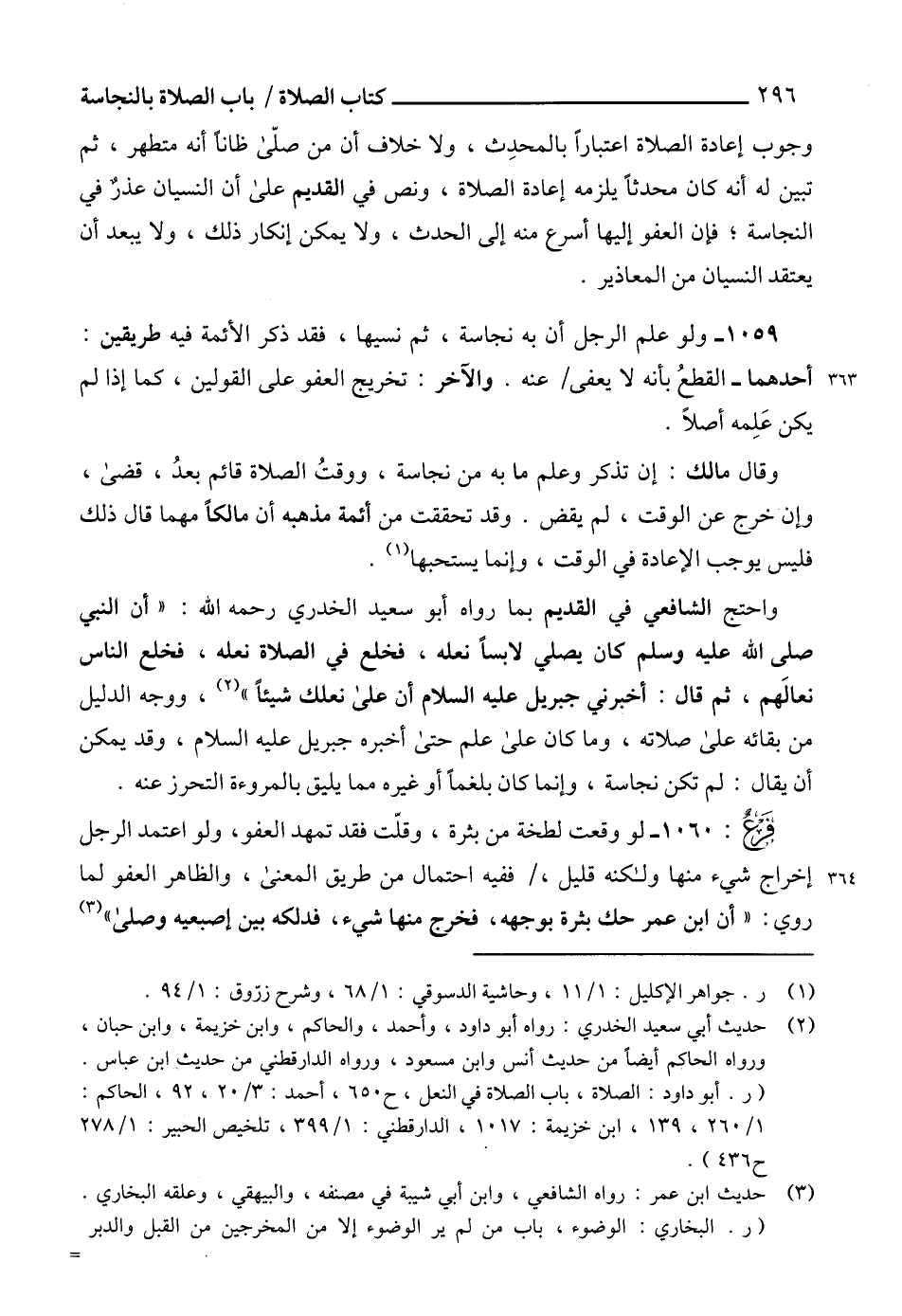 واحتج الشافعي في القديم بما رواه أبو سعيد الخدري رحمه الله: "أن النبي صلى الله عليه وسلم كان يصلي لابساً نعله، فخلع في الصلاة نعله، فخلع الناس نعالَهم، ثم قال: أخبرني جبريل عليه السلام أن على نعلك شيئاًً" (¬2)، ووجه الدليل من بقائه على صلاته، وما كان على علم حتى أخبره جبريل عليه السلام، وقد يمكن أن يقال: لم تكن نجاسة، وإنما كان بلغماً أو غيره مما يليق بالمروءة التحرز عنه.