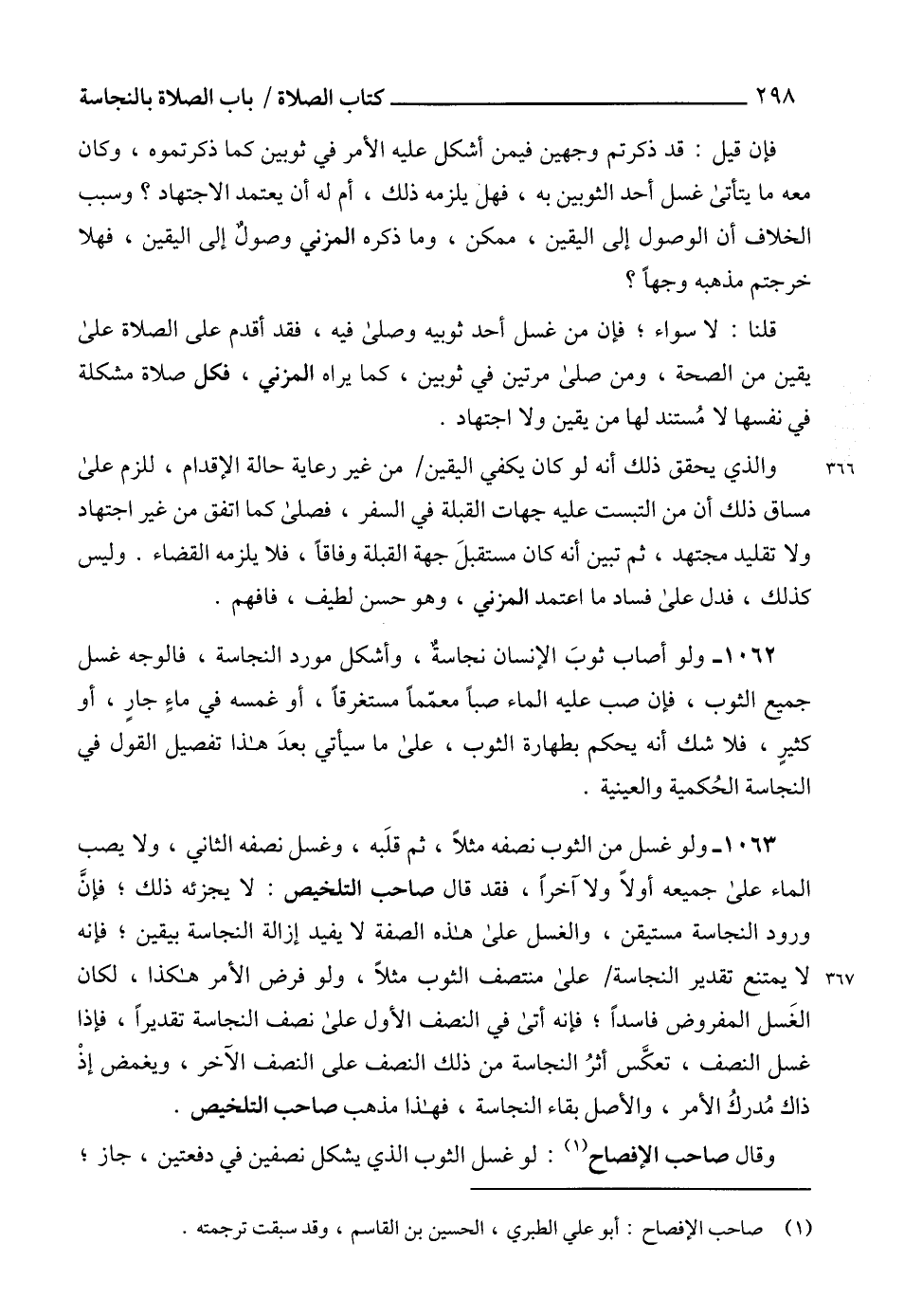 1062 - ولو أصاب ثوبَ الإنسان نجاسةٌ، وأشكل مورد النجاسة، فالوجه غسل جميع الثوب، فإن صب عليه الماء صباً معمّماً مستغرقاً، أو غمسه في ماءٍ جارٍ، أو كثير، فلا شك أنه يحكم بطهارة الثوب، على ما سيأتي بعدَ هذا تفصيل القول في النجاسة الحُكمية والعينية.