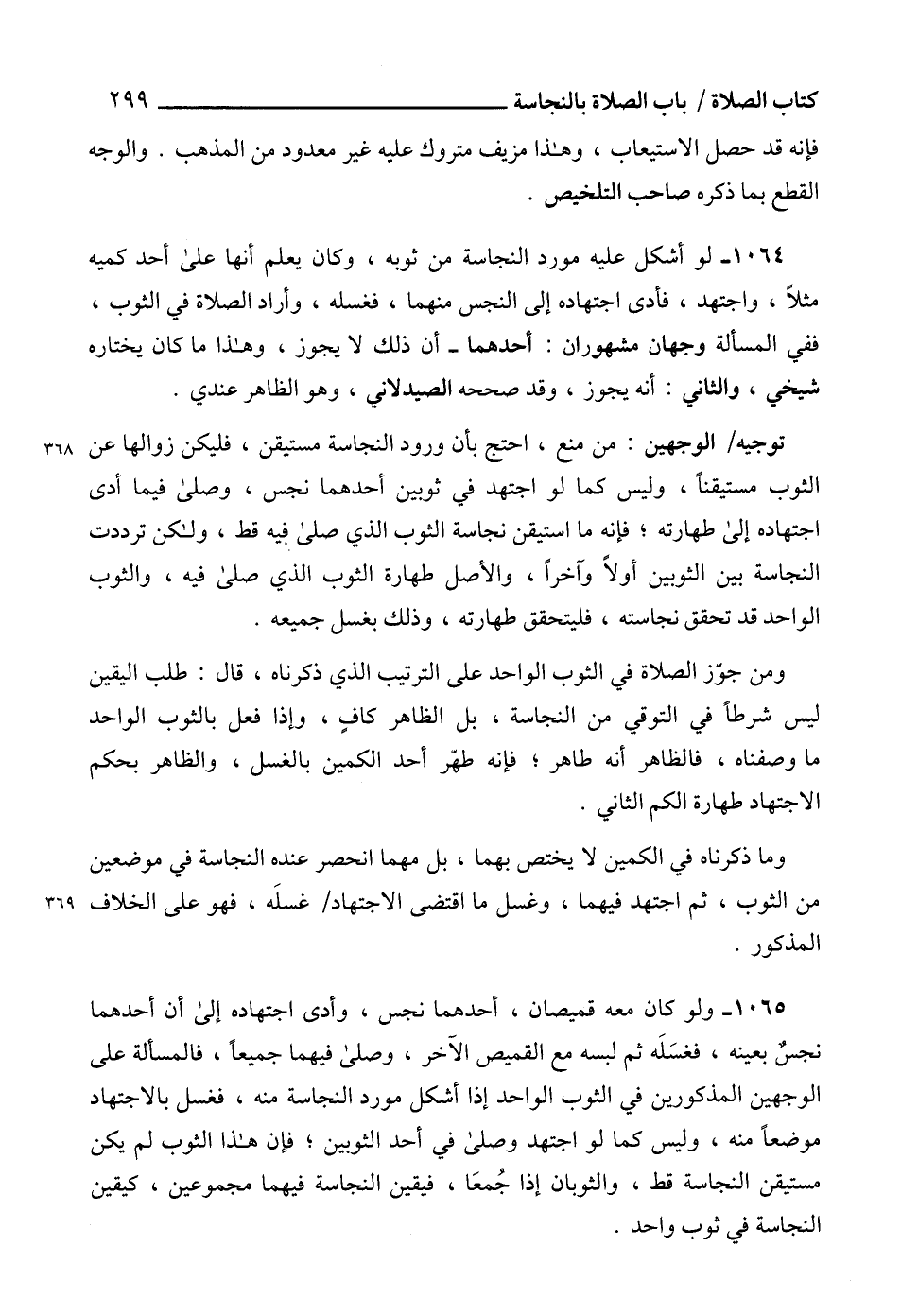 1064 - لو أشكل عليه مورد النجاسة من ثوبه، وكان يعلم أنها على أحد كميه مثلاً، واجتهد، فأدى اجتهاده إلى النجس منهما، فغسله، وأراد الصلاة في الثوب، ففي المسألة وجهان مشهوران: أحدهما - أن ذلك لا يجوز، وهذا ما كان يختاره شيخي، والثاني: أنه يجوز، وقد صححه الصيدلاني، وهو الظاهر عندي.