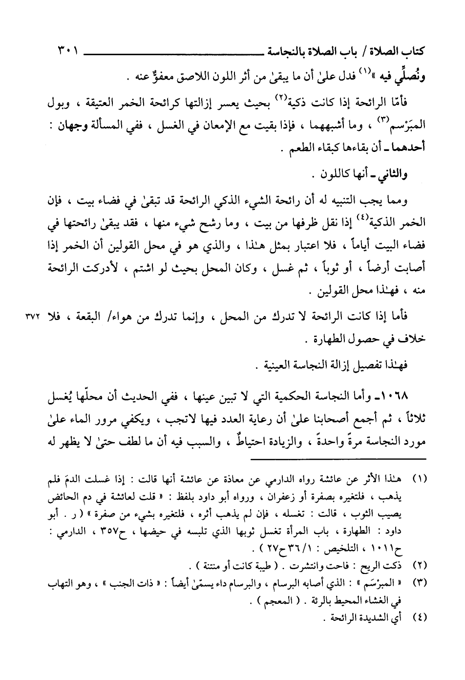 1068 - وأما النجاسة الحكمية التي لا تبين عينها، ففي الحديث أن محلّها يُغسل ثلاثاً، ثم أجمع أصحابنا على أن رعاية العدد فيها لا تجب، ويكفي مرور الماء على مورد النجاسة مرةً واحدة، والزيادة احتياطٌ، والسبب فيه أن ما لطف حتى لا يظهر له
