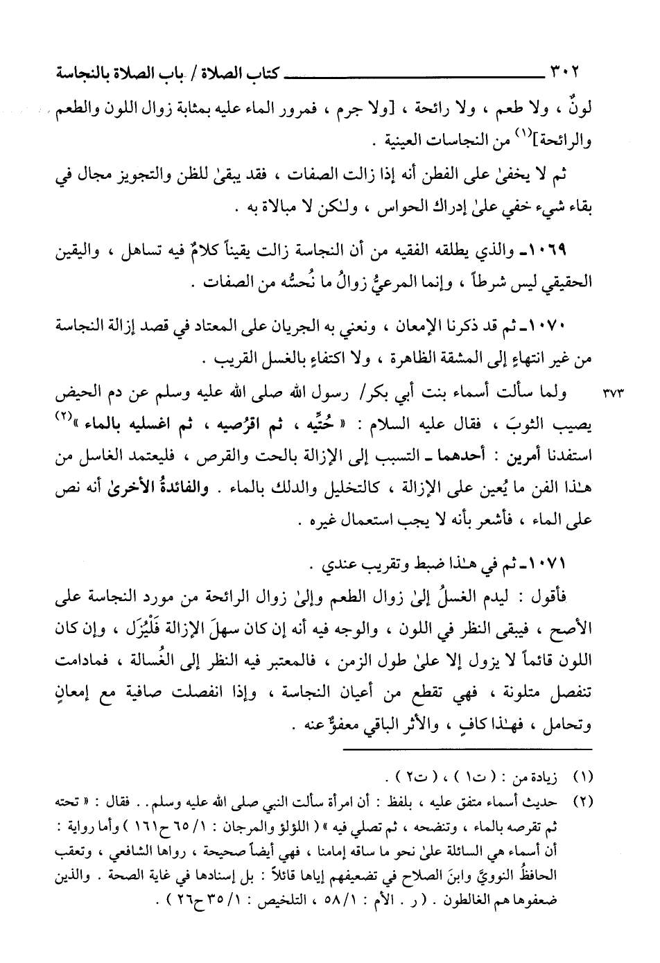 (¬2) حديث أسماء متفق عليه، بلفظ: أن امرأة سألت النبي صلى الله عليه وسلم .. فقال: "تحته ثم تقرصه بالماء، وتنضحه، ثم تصلي فيه" (اللؤلؤ والمرجان: 1/ 65 ح 161) وأما رواية: أن أسماء هي السائلة على نحو ما ساقه إمامنا، فهي أيضاً صحيحة، رواها الشافعي، وتعقب الحافظُ النووي وابنَ الصلاح في تضعيفهم إياها قائلاً: بل إسنادها في غاية الصحة. والذين ضعفوها هم الغالطون. (ر. الأم: 1/ 58، التلخيص: 1/ 35 ح 26).