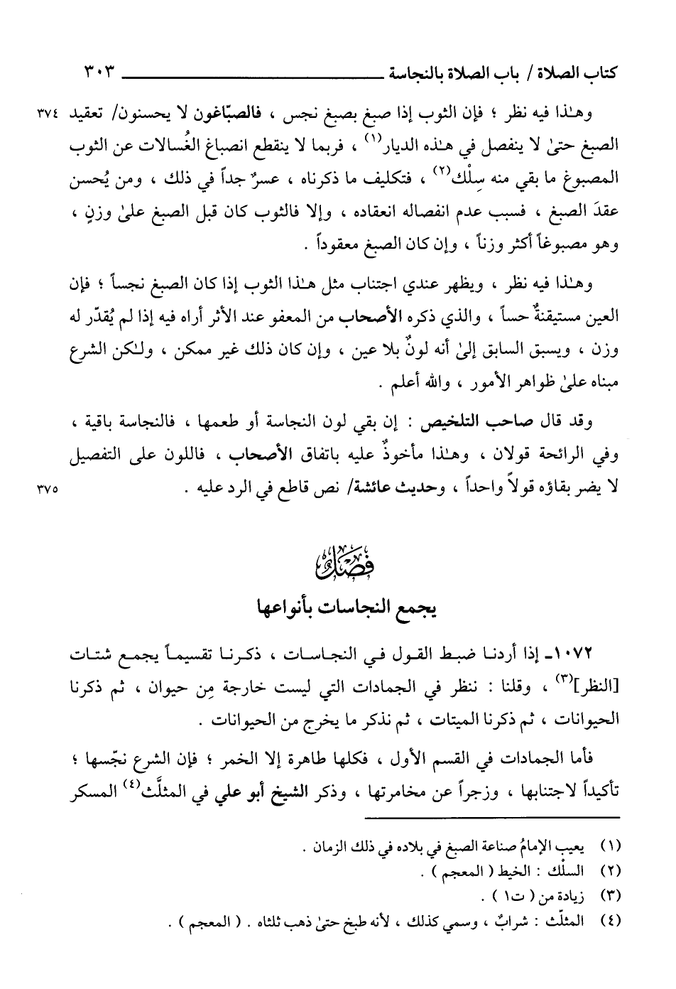 وهذا فيه نظر؛ فإن الثوب إذا صبغ بصبغ نجس، فالصبّاغون لا يحسنون تعقيد الصبغ حتى لا ينفصل في هذه الديار (¬1)، فربما لا ينقطع انصباغ الغُسالات عن الثوب المصبوغ ما بقي منه سِلْك (¬2)، فتكليف ما ذكرناه، عسر جداً في ذلك، ومن يُحسن عقدَ الصبغ، فسبب عدم انفصاله انعقاده، وإلا فالثوب كان قبل الصبغ على وزنٍ، وهو مصبوغاً أكثر وزناً، وإن كان الصبغ معقوداً.