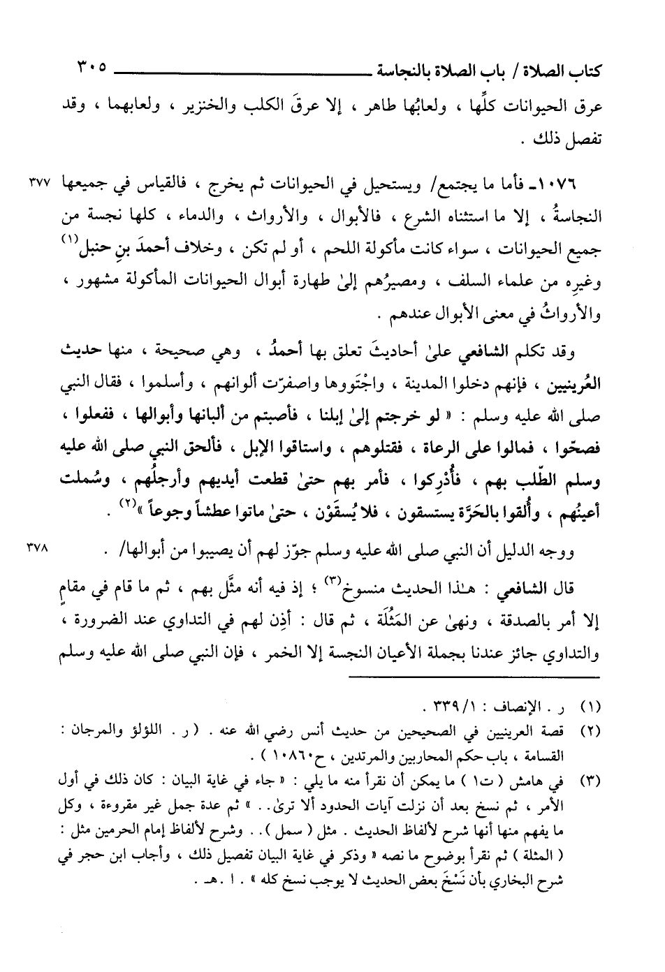 1076 - فأما ما يجتمع ويستحيل في الحيوانات ثم يخرج، فالقياس في جميعها النجاسةُ، إلا ما استثناه الشرع، فالأبوال، والأرواث، والدماء، كلها نجسة من جميع الحيوانات، سواء كانت مأكولة اللحم، أو لم تكن، وخلاف أحمدَ بنِ حنبل (¬1) وغيرِه من علماء السلف، ومصيرُهم إلى طهارة أبوال الحيوانات المأكولة مشهور، والأرواثُ في معنى الأبوال عندهم.