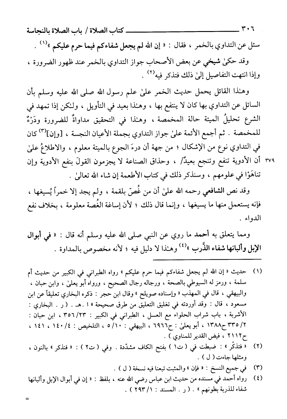 (¬1) حديث "إن الله لم يجعل شفاءكم فيما حرم عليكم" رواه الطبراني في الكبير من حديث أم سلمة، ورمز له السيوطي بالصحة، ورجاله رجال الصحيح، ورواه أبو يعلى، وابن حبان، والبيهقي، قال في المهذب " وإسناده صويلح " وقال ابن حجر: ذكره البخاري تعليقاً عن ابن مسعود، قال: وقد أوردته في تغليق التعليق من طرق صحيحة" ا. هـ. (ر. البخاري: الأشربة، باب شراب الحلواء مع العسل، الطبراني في الكبير: 23/ 356، ابن حبان: 2/ 335 ح 1388، أبو يعلى: ح 6966، البيهقي: 10/ 5، التلخيص: 4/ 140، 141، ح 2112، فيض القدير للمناوي).