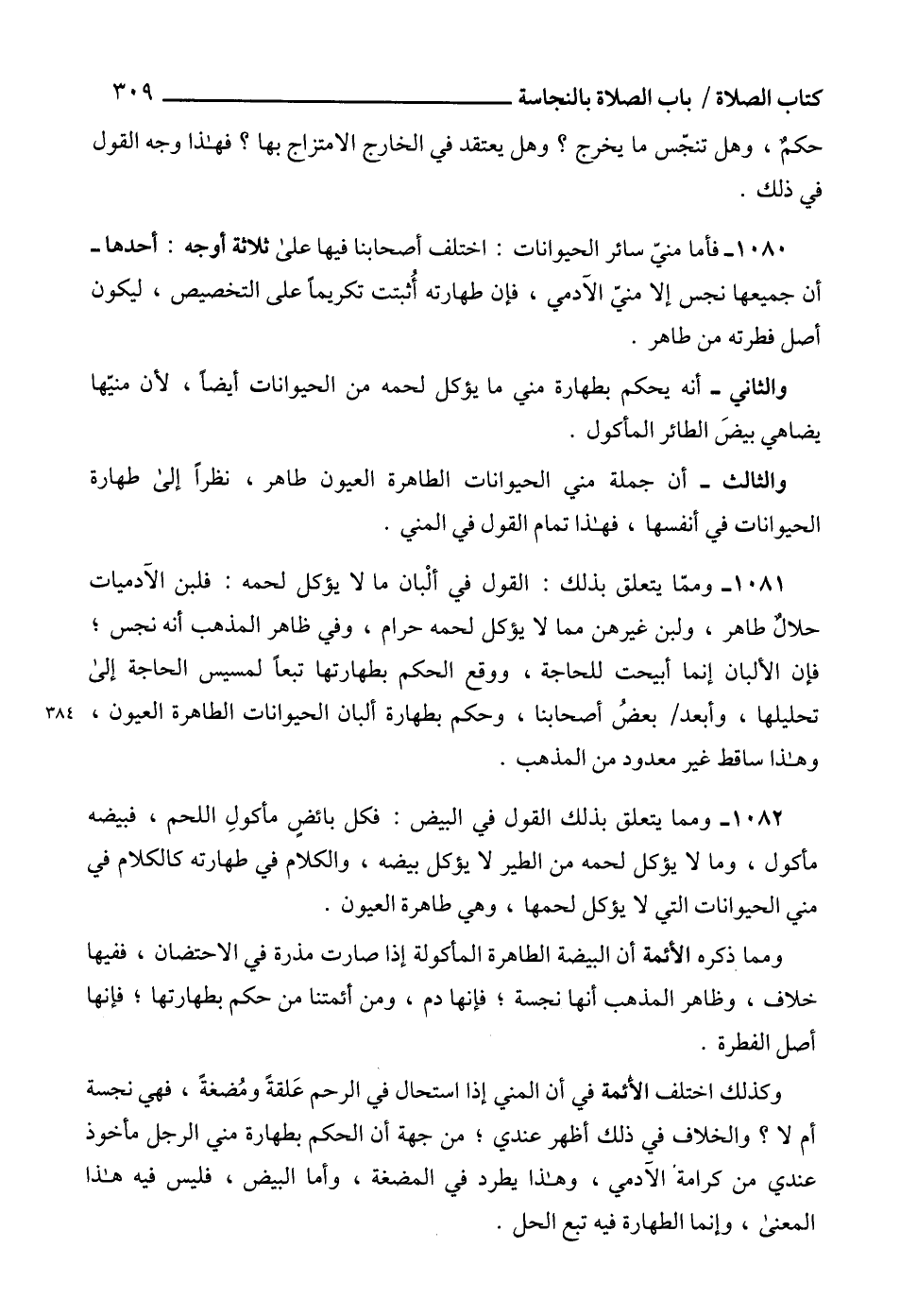 1082 - ومما يتعلق بذلك القول في البيض: فكل بائضٍ مأكولِ اللحم، فبيضه مأكول، وما لا يؤكل لحمه من الطير لا يؤكل بيضه، والكلام في طهارته كالكلام في مني الحيوانات التي لا يؤكل لحمها، وهي طاهرة العيون.
