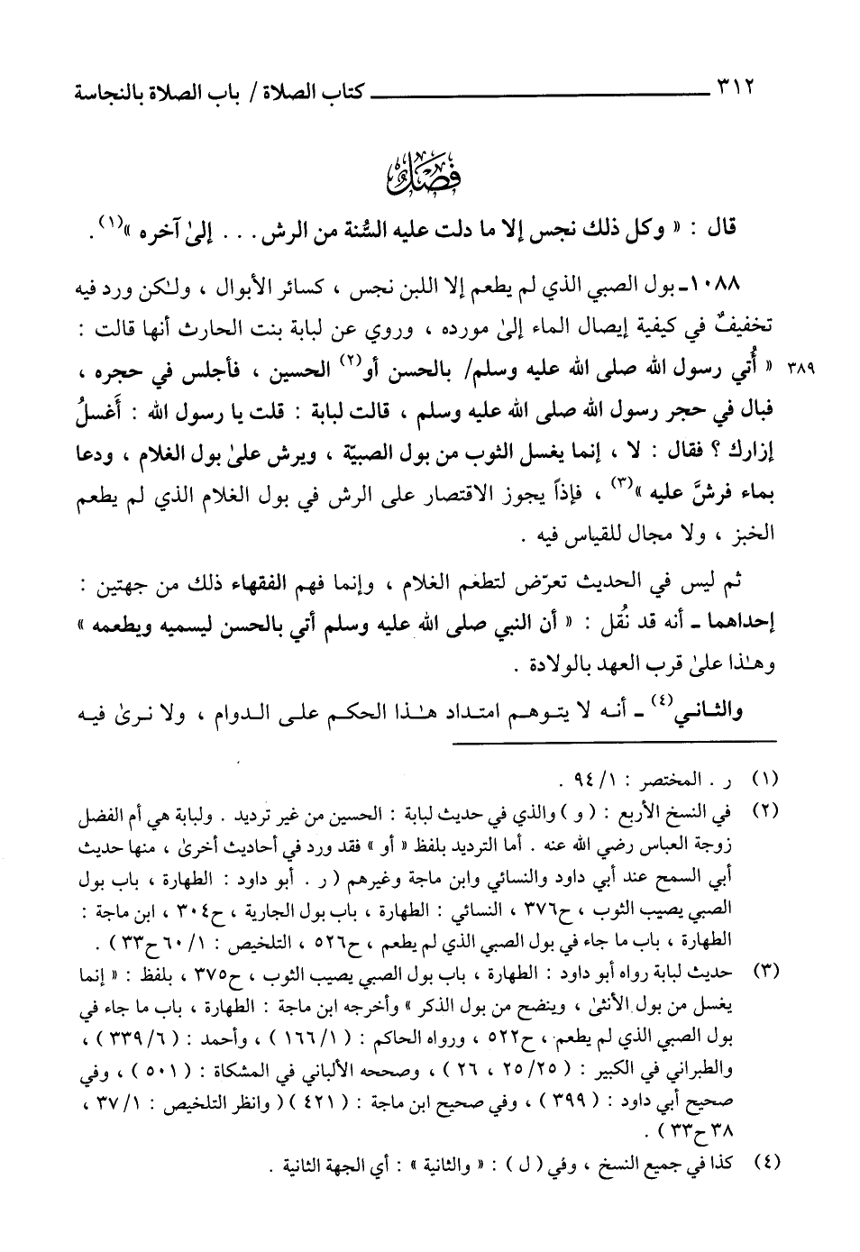 (¬3) حديث لبابة رواه أبو داود: الطهارة، باب بول الصبي يصيب الثوب، ح 375، بلفظ: "إنما يغسل من بول الأنثى، وينضح من بول الذكر" وأخرجه ابن ماجة: الطهارة، باب ما جاء في بول الصبي الذي لم يطعم، ح 522، ورواه الحاكم: (1/ 166)، وأحمد: (6/ 339)، والطبراني في الكبير: (25/ 25، 26)، وصححه الألباني في المشكاة: (501)، وفي صحيح أبي داود: (399)، وفي صحيح ابن ماجة: (421) (وانظر التلخيص: 1/ 37، 38 ح 33).