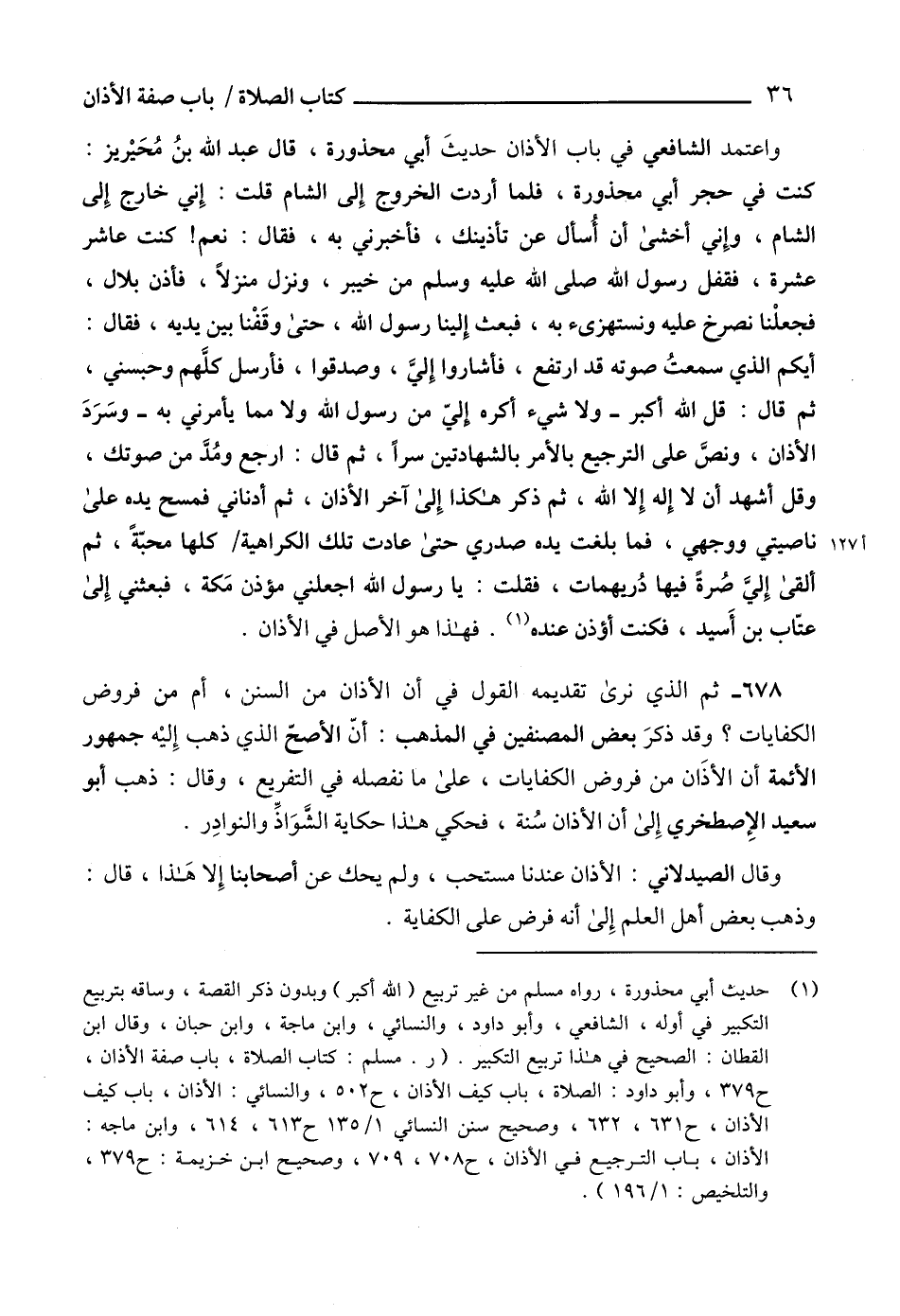 678 - ثم الذي نرى تقديمه القول في أن الأذان من السنن، أم من فروض الكفايات؟ وقد ذكرَ بعض المصنفين في المذهب: أنّ الأصحّ الذي، ذهب إِليْه جمهور الأئمة أن الأذَان من فروض الكفايات، على ما نفصله في التفريع، وقال: ذهب أبو سعيد الإصطخري إِلى أن الأذان سُنة، فحكي هذا حكاية الشَّوَاذِّ والنوادِر.