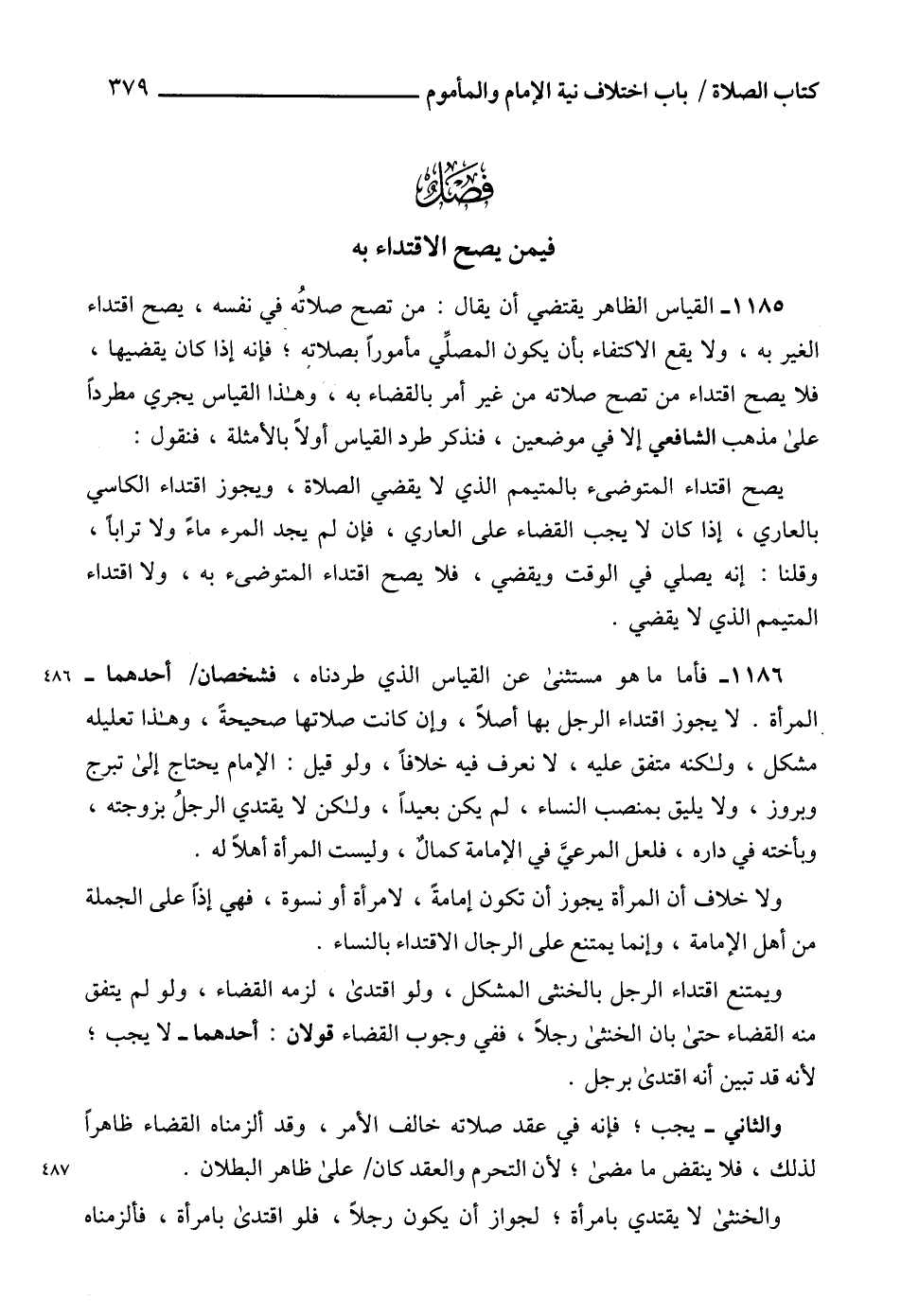 1185 - القياس الظاهر يقتضي أن يقال: من تصح صلاتُه في نفسه، يصح اقتداء الغير به، ولا يقع الاكتفاء بأن يكون المصلِّي مأموراً بصلاته؛ فإنه إذا كان يقضيها، فلا يصح اقتداء من تصح صلاته من غير أمر بالقضاء به، وهذا القياس يجري مطرداً على مذهب الشافعي إلا في موضعين، فنذكر طرد القياس أولاً بالأمثلة، فنقول: يصح اقتداء المتوضىء بالمتيمم الذي لا يقضي الصلاة، ويجوز اقتداء الكاسي بالعاري، إذا كان لا يجب القضاء على العاري، فإن لم يجد المرء ماءً ولا تراباً، وقلنا: إنه يصلي في الوقت ويقضي، فلا يصح اقتداء المتوضىء به، ولا اقتداء المتيمم الذي لا يقضي.