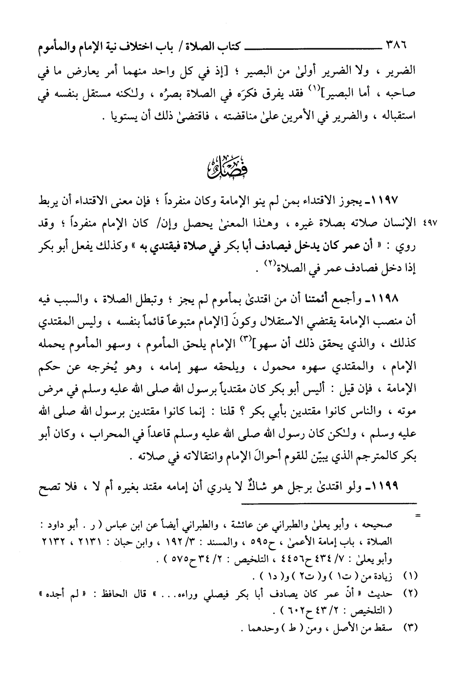 1198 - وأجمع أئمتنا أن من اقتدى بمأموم لم يجز؛ وتبطل الصلاة، والسبب فيه أن منصب الإمامة يقتضي الاستقلال وكونَ [الإمام متبوعاً قائماً بنفسه، وليس المقتدي كذلك، والذي يحقق ذلك أن سهو] (3) الإمام يلحق المأموم، وسهو المأموم يحمله الإمام، والمقتدي سهوه محمول، ويلحقه سهو إمامه، وهو يُخرجه عن حكم الإمامة، فإن قيل: أليس أبو بكر كان مقتدياً برسول الله صلى الله عليه وسلم في مرض موته، والناس كانوا مقتدين بأبي بكر؟ قلنا: إنما كانوا مقتدين برسول الله صلى الله عليه وسلم، ولكن كان رسول الله صلى الله عليه وسلم قاعداً في المحراب، وكان أبو بكر كالمترجم الذي يبيّن للقوم أحوالَ الإمام وانتقالاته في صلاته.