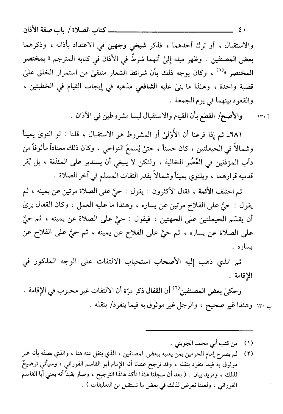 681 - ثم إِذا فرعنا أن الأَوْلى أو المشروط هو الاستقبال، قلنا: لو التوى يميناً وشمالاً في الحيعلتين، كان حسناً، حتى يُسمعَ النواحي، وكان ذلك معتاداً مألوفاً من دأب المؤذنين في العُصُر الخالية، ولكن لا ينبغي أن يستدير على المئذنة، بل يُقر قدميه قرارهما، ويلتوي يميناً وشمالاً بقدر التفات المسلم في آخر الصلاة.