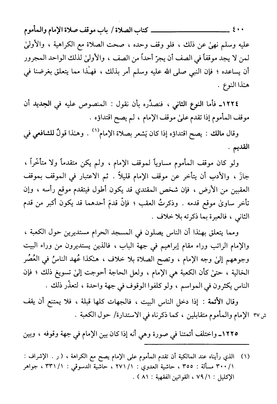 (1) الذي رأيناه عند المالكية أن تقدم المأموم على الإمام يصح مع الكراهة، (ر. الإشراف: 1/ 300 مسألة: 355، حاشية العدوي: 1/ 271، حاشية الدسوقي: 1/ 331، جواهر الإكليل: 1/ 79، القوانين الفقهية: 81).