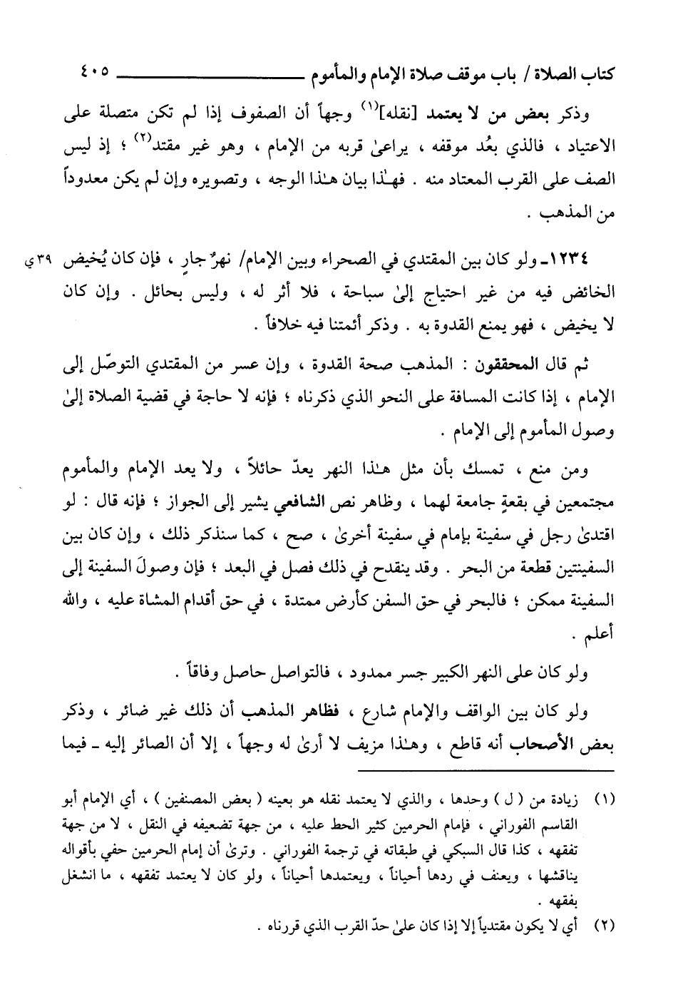 1234 - ولو كان بين المقتدي في الصحراء وبين الإمام نهر جار، فإن كان يُخيض الخائض فيه من غير احتياج إلى سباحة، فلا أثر له، وليس بحائل. وإن كان لا يخيض، فهو يمنع القدوة به. وذكر أئمتنا فيه خلافاً.