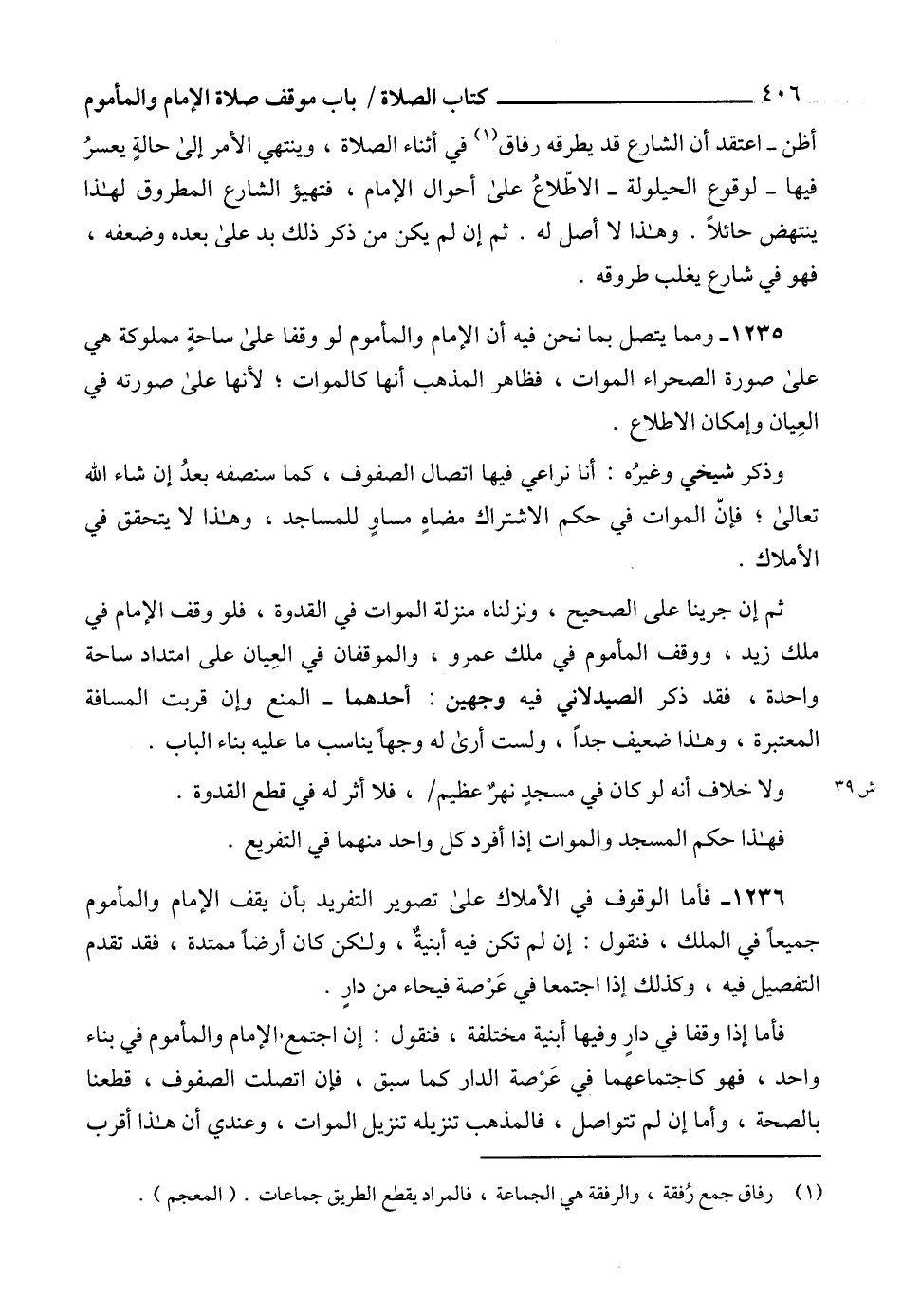1235 - ومما يتصل بما نحن فيه أن الإمام والمأموم لو وقفا على ساحةٍ مملوكة هي على صورة الصحراء الموات، فظاهر المذهب أنها كالموات؛ لأنها على صورته في العِيان وإمكان الاطلاع.
