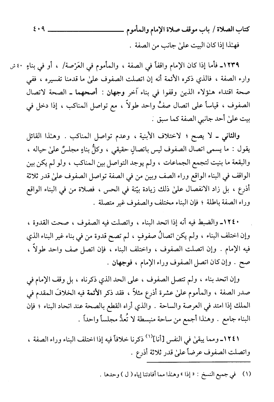 1241 - ومما يبقى في النفس [أنا] (1) ذكرنا خلافاً فيه إذا اختلف البناء وراء الصفة، واتصلت الصفوف عرضاً على قدر ثلاثة أذرع.