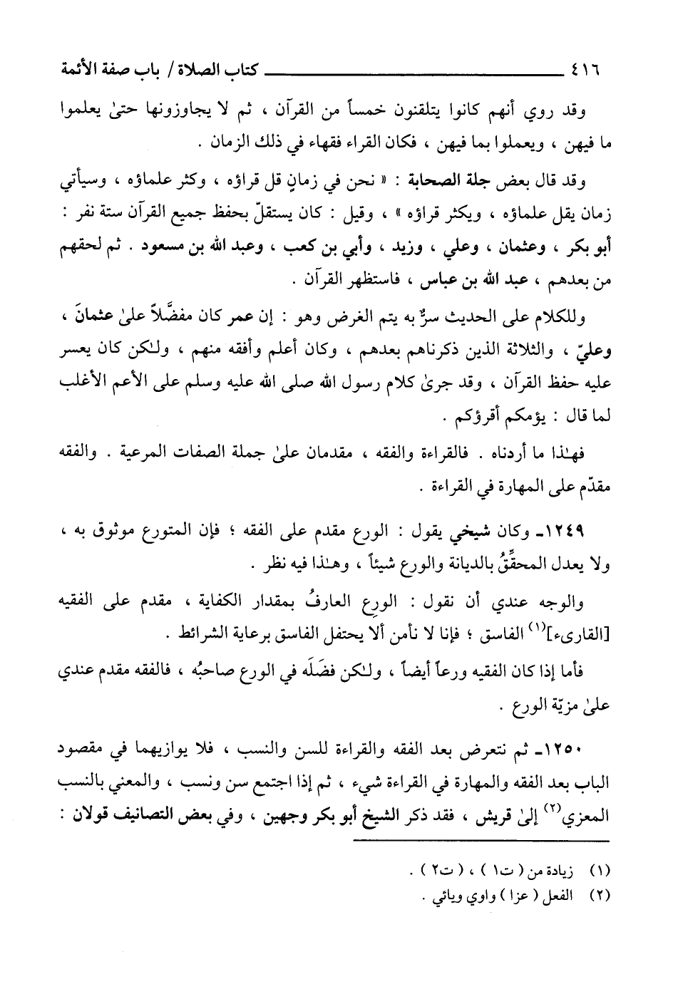 1250 - ثم نتعرض بعد الفقه والقراءة للسن والنسب، فلا يوازيهما في مقصود الباب بعد الفقه والمهارة في القراءة شيء، ثم إذا اجتمع سن ونسب، والمعني بالنسب المعزي (2) إلى قريش، فقد ذكر الشيخ أبو بكر وجهين، وفي بعض التصانيف قولان: