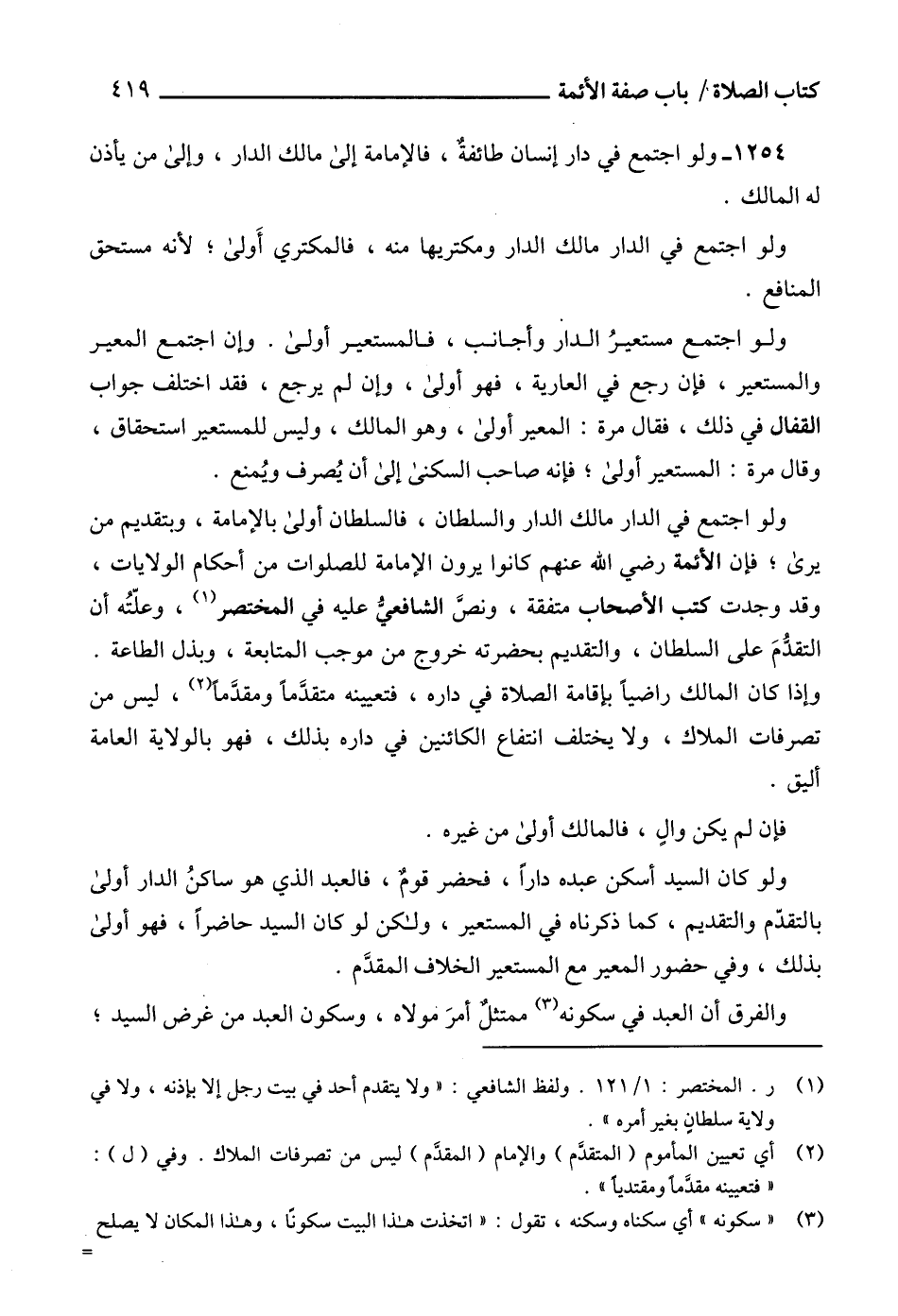 وإذا كان المالك راضياً بإقامة الصلاة في داره، فتعيينه متقدَّماً ومقدَّماً (2)، ليس من تصرفات الملاك، ولا يختلف انتفاع الكائنين في داره بذلك، فهو بالولاية العامة أليق.