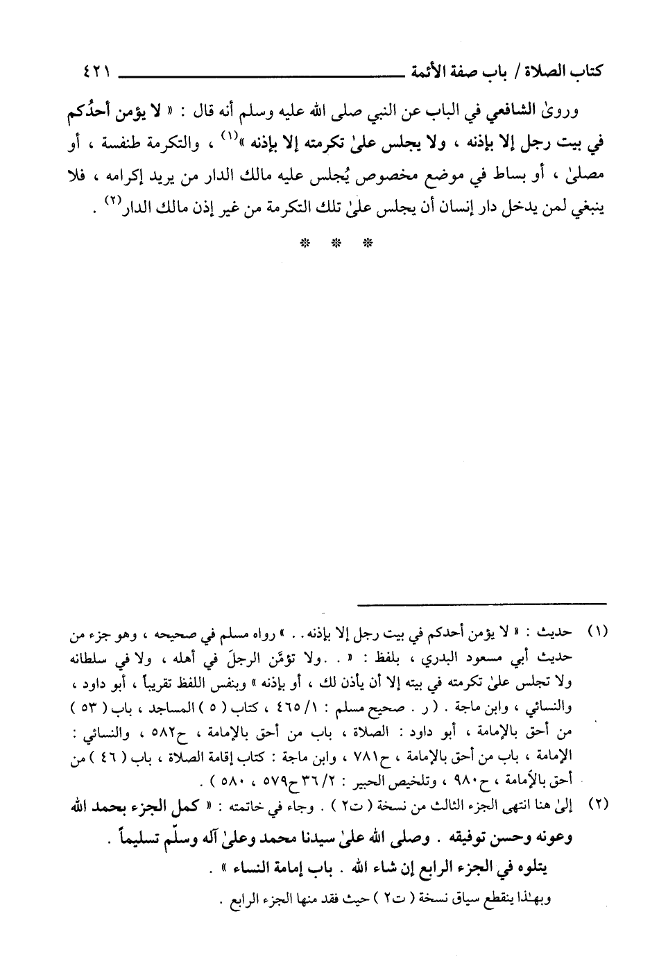 (1) حديث: "لا يؤمن أحدكم في بيت رجل إلا بإذنه .. " رواه مسلم في صحيحه، وهو جزء من حديث أبي مسعود البدري، بلفظ: " .. ولا تؤمَّن الرجلَ في أهله، ولا في سلطانه ولا تجلس على تكرمته في بيته إلا أن يأذن لك، أو بإذنه" وبنفس اللفظ تقريباًً، أبو داود، والنسائي، وابن ماجة. (ر. صحيح مسلم: 1/ 465، كتاب (5) المساجد، باب (53) من أحق بالإمامة، أبو داود: الصلاة، باب من أحق بالإمامة، ح 582، والنسائي: الإمامة، باب من أحق بالإمامة، ح 781، وابن ماجة: كتاب إقامة الصلاة، باب (46) من أحق بالإمامة، ح 980، وتلخيص الحبير: 2/ 36 ح 579، 580).