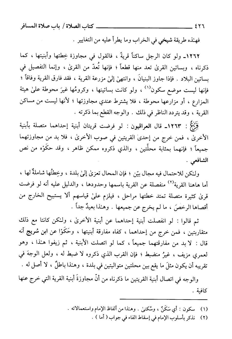 1263 - قال العراقيون: لو فرضت قريتان أبنية إحداهما متصلة بأبنية الأخرى، فمن خرج من إحدى القريتين في صوب الأخرى، فلا بد من مجاوزتهما جميعاًً؛ فإنهما بمثابة محلَّتين، والذي ذكروه ممكن ظاهر، وقد حكَوْه من نص الشافعي.