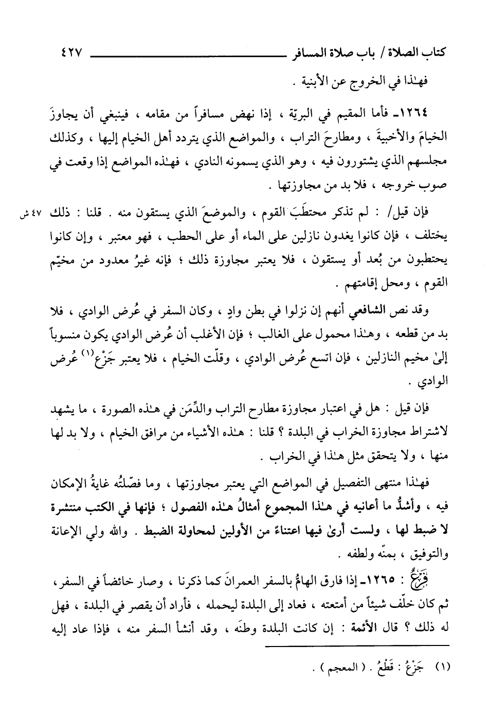 1264 - فأما المقيم في البريّة، إذا نهض مسافراً من مقامه، فينبغي أن يجاوزَ الخيامَ والأخبيةَ، ومطارحَ التراب، والمواضع الذي يتردد أهل الخيام إليها، وكذلك مجلسهم الذي يشتورون فيه، وهو الذي يسمونه النادي، فهذه المواضع إذا وقعت في صوب خروجه، فلا بد من مجاوزتها.