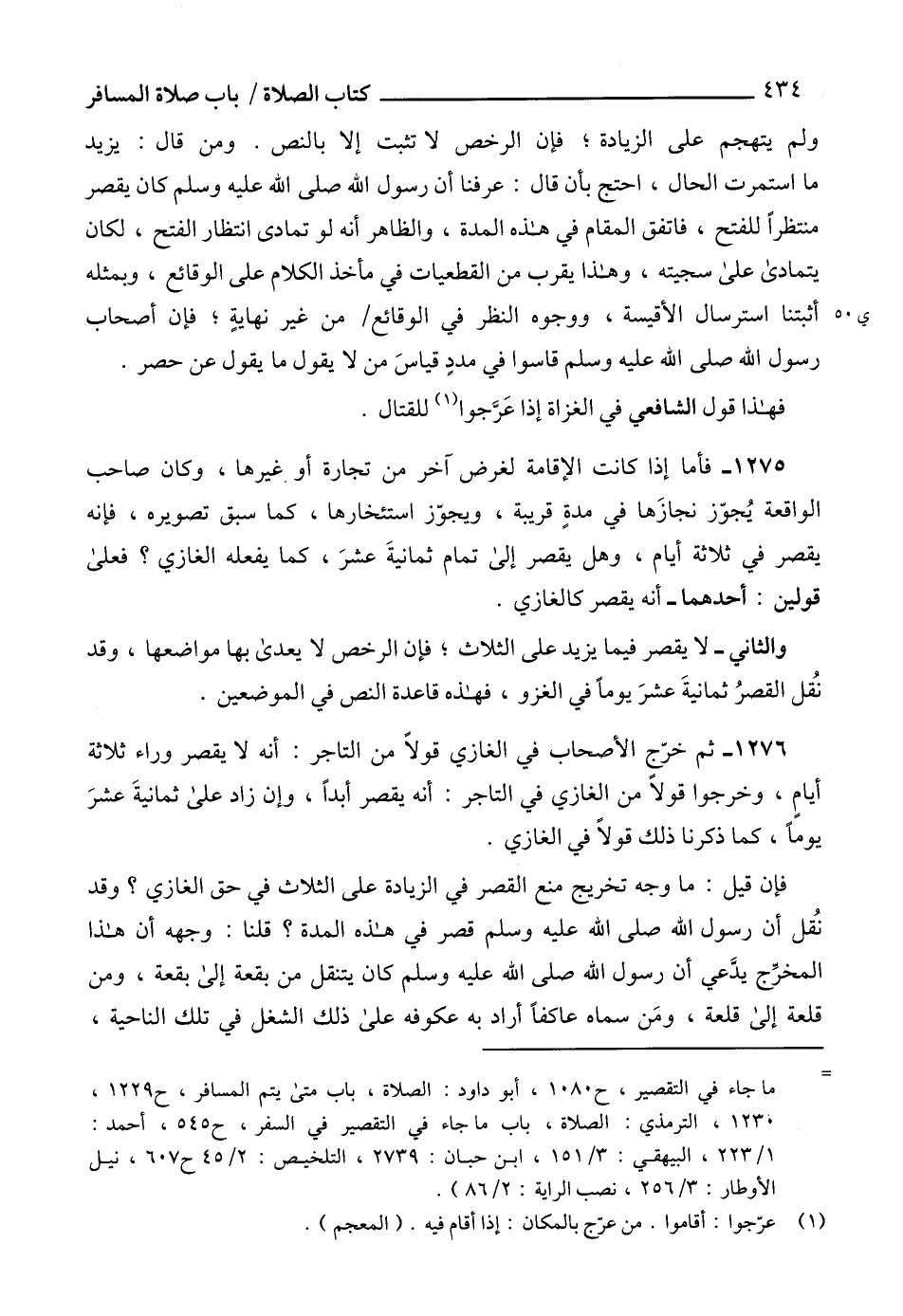 1276 - ثم خرّج الأصحاب في الغازي قولاً من التاجر: أنه لا يقصر وراء ثلاثة أيام، وخرجوا قولاً من الغازي في التاجر: أنه يقصر أبداً، وإن زاد على ثمانيةَ عشرَ يوماً، كما ذكرنا ذلك قولاً في الغازي.