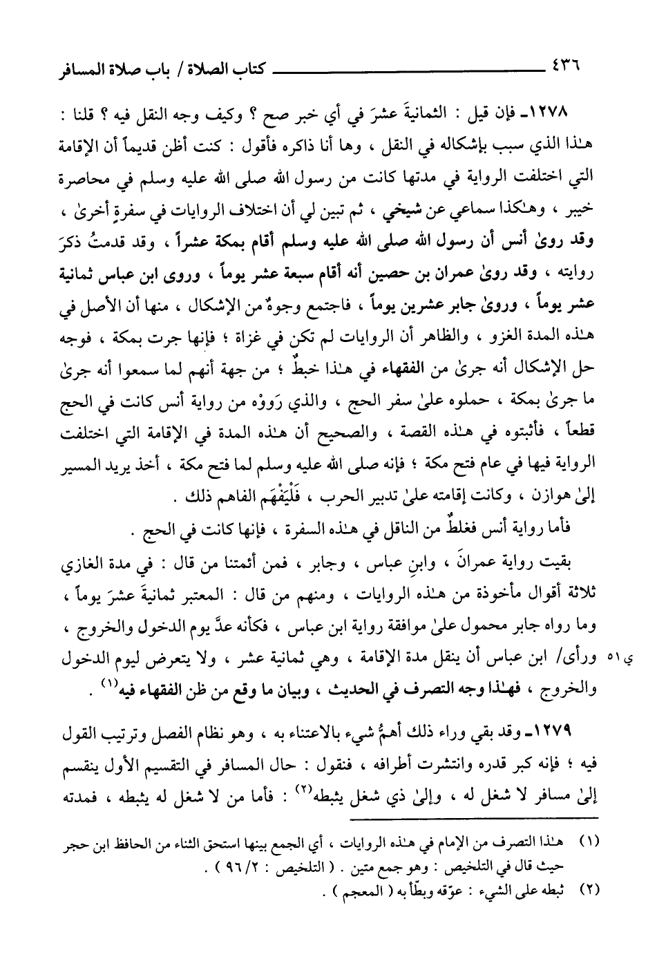 1278 - فإن قيل: الثمانيةَ عشرَ في أي خبر صح؟ وكيف وجه النقل فيه؟ قلنا: هذا الذي سبب بإشكاله في النقل، وها أنا ذاكره فأقول: كنت أظن قديماً أن الإقامة التي اختلفت الرواية في مدتها كانت من رسول الله صلى الله عليه وسلم في محاصرة خيبر، وهكذا سماعي عن شيخي، ثم تبين لي أن اختلاف الروايات في سفرةٍ أخرى، وقد روى أنس أن رسول الله صلى الله عليه وسلم أقام بمكة عشراً، وقد قدمتُ ذكرَ روايته، وقد روى عمران بن حصين أنه أقام سبعة عشر يوماً، وروى ابن عباس ثمانية عشر يوماً، وروى جابر عشرين يوماً، فاجتمع وجوهٌ من الإشكال، منها أن الأصل في هذه المدة الغزو، والظاهر أن الروايات لم تكن في غزاة؛ فإنها جرت بمكة، فوجه حل الإشكال أنه جرى من الفقهاء في هذا خبطٌ؛ من جهة أنهم لما سمعوا أنه جرى ما جرى بمكة، حملوه على سفر الحج، والذي رَووْه من رواية أنس كانت في الحج قطعاً، فأثبتوه في هذه القصة، والصحيح أن هذه المدة في الإقامة التي اختلفت الرواية فيها في عام فتح مكة؛ فإنه صلى الله عليه وسلم لما فتح مكة، أخذ يريد المسير إلى هوازن، وكانت إقامته على تدبير الحرب، فَلْيَفْهَم الفاهم ذلك.