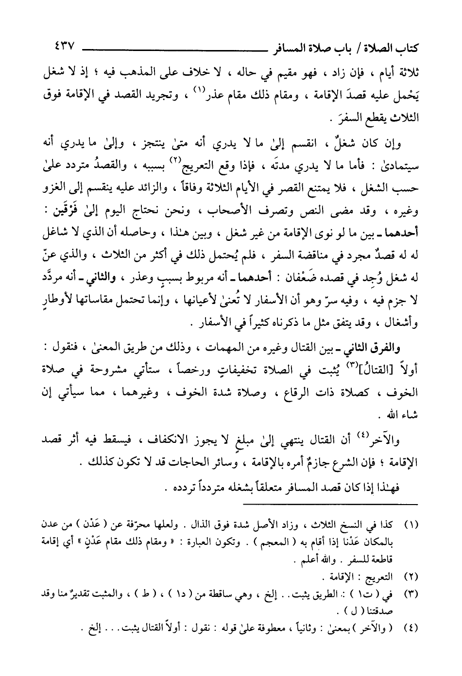 وإن كان شغلٌ، انقسم إلى ما لا يدري أنه متى ينتجز، وإلى ما يدري أنه سيتمادى: فأما ما لا يدري مدتَه، فإذا وقع التعريج (2) بسببه، والقصدُ متردد على حسب الشغل، فلا يمتنع القصر في الأيام الثلاثة وفاقاً، والزائد عليه ينقسم إلى الغزو وغيره، وقد مضى النص وتصرف الأصحاب، ونحن نحتاج اليوم إلى فَرْقَين: أحدهما - بين ما لو نوى الإقامة من غير شغل، وبين هذا، وحاصله أن الذي لا شاغل له له قصدٌ مجرد في مناقضة السفر، فلم يُحتمل ذلك في أكثر من الثلاث، والذي عنّ له شغل وُجِد في قصده ضَعْفان: أحدهما - أنه مربوط بسببٍ وعذر، والثاني - أنه مردَّد لا جزم فيه، وفيه سرّ وهو أن الأسفار لا تُعنى لأعيانها، وإنما تحتمل مقاساتها لأوطارٍ وأشغال، وقد يتفق مثل ما ذكرناه كثيراً في الأسفار.